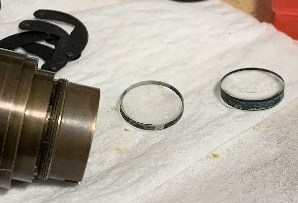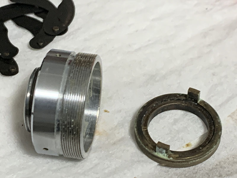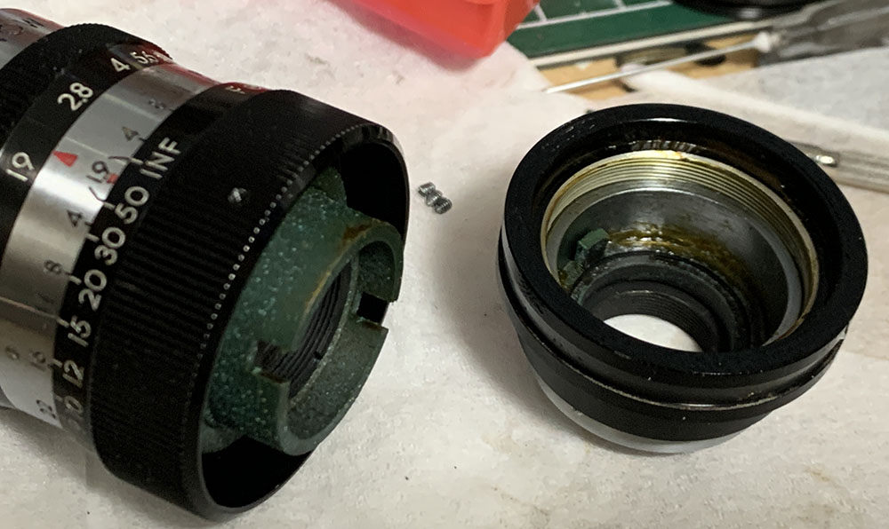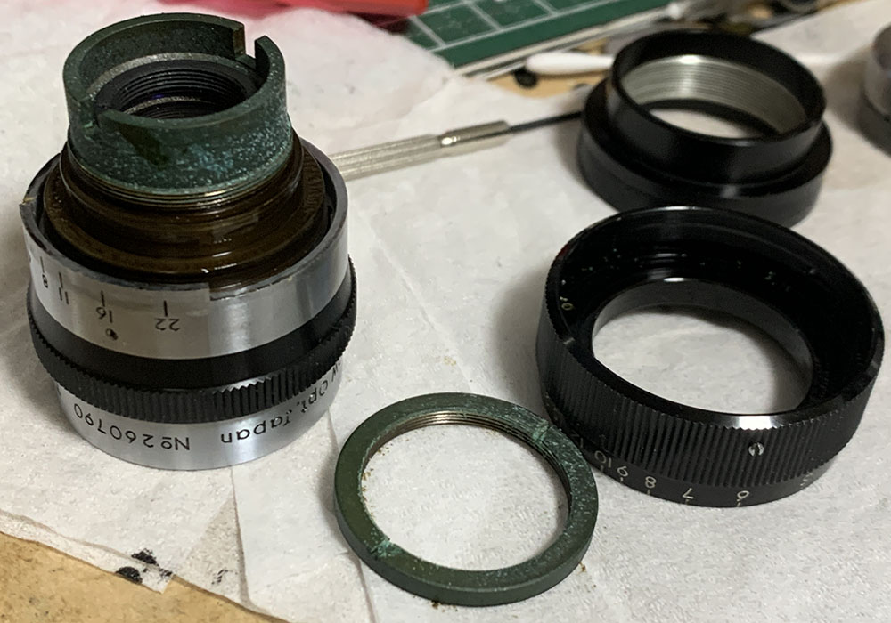 The focusing ring can be removed by unscrewing its retainer off. The corrosion was so bad it turned everything green.