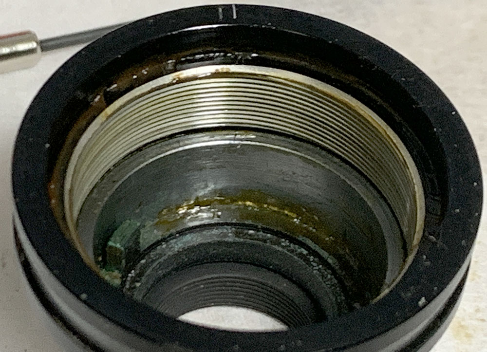 The corrosion was thoroughly brushed-away and all of the parts cleaned. I made sure that no residue was left before I reassembled this. Clean the glass carefully, if your lens has fungus then my article on cleaning lens fungus should help give you some idea as to how I deal with it. The helicoids benefit from grease that have some bit of resistance, this will allow you to turn the focusing ring more precisely.