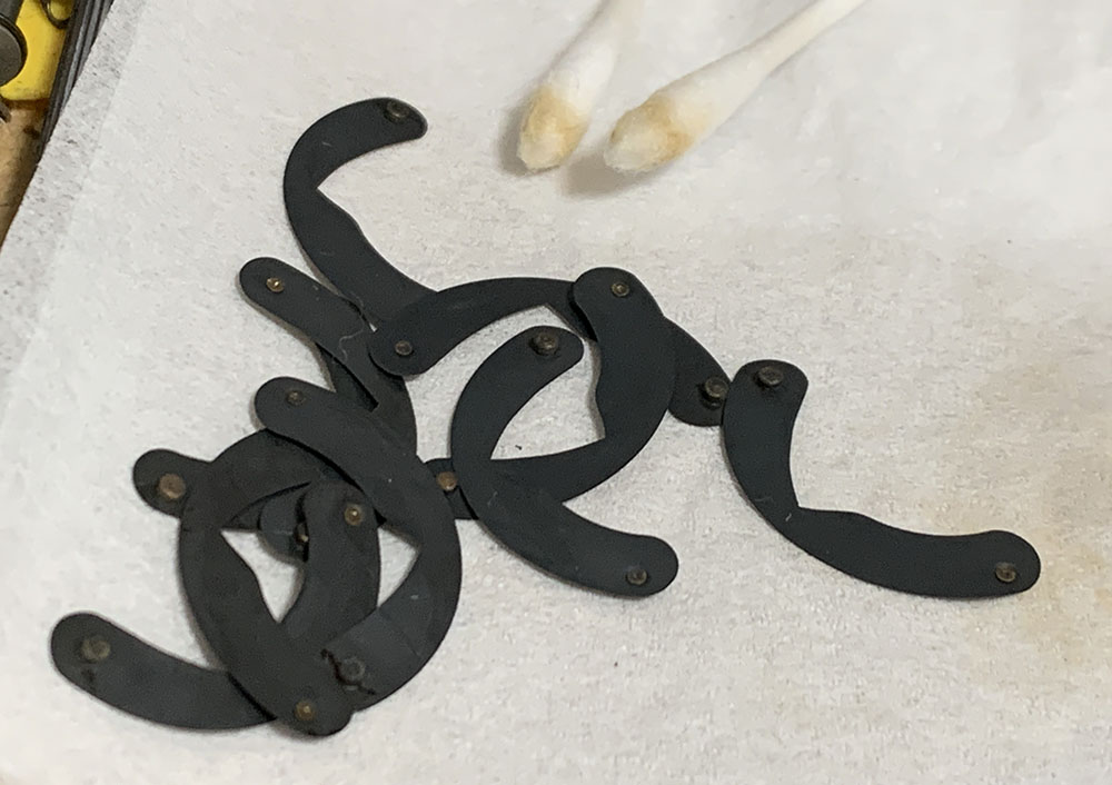 Clean the leaves very well with Q-tips saturated with solvents. Note how filthy they were, I may have used 2-3 Q-tips in this operation. Be careful while you wipe them clean so you won’t damage anything.