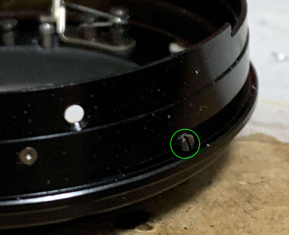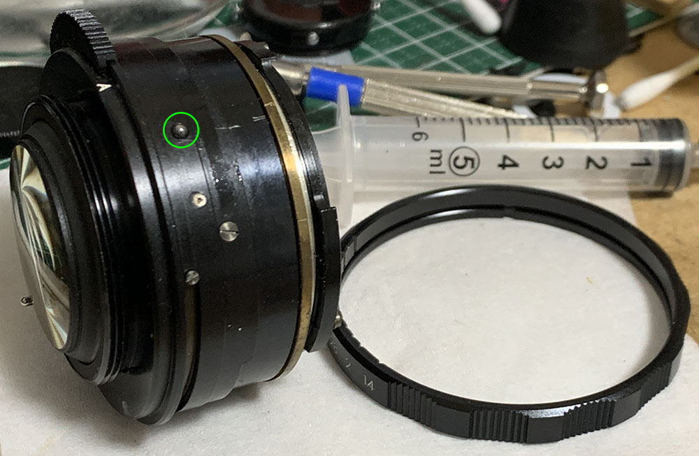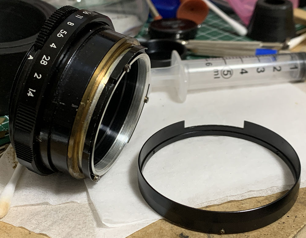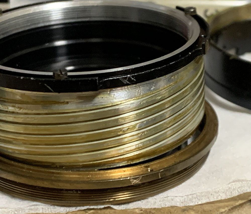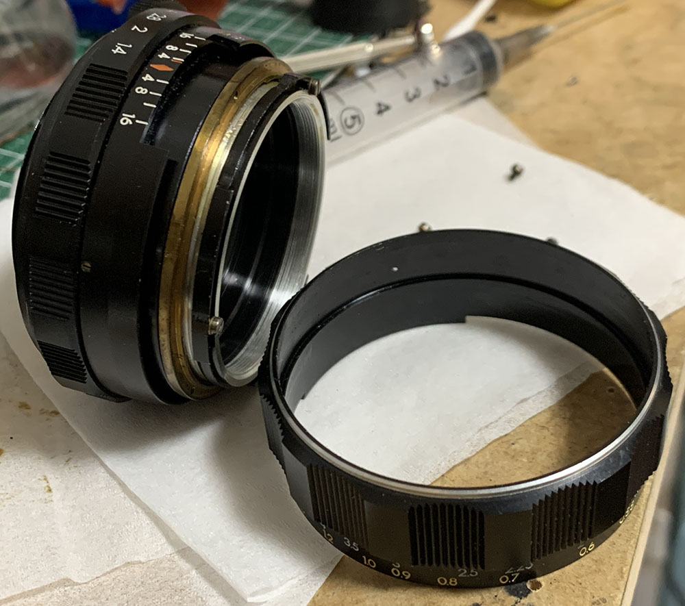 It’s spring-loaded so it will jettison across the table. This is also the best time to note the helicoids’ alignment, I made a few scratches so I will know how the helicoids should align when the barrel is set to infinity.
