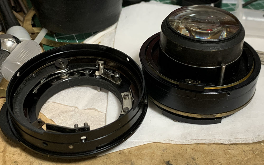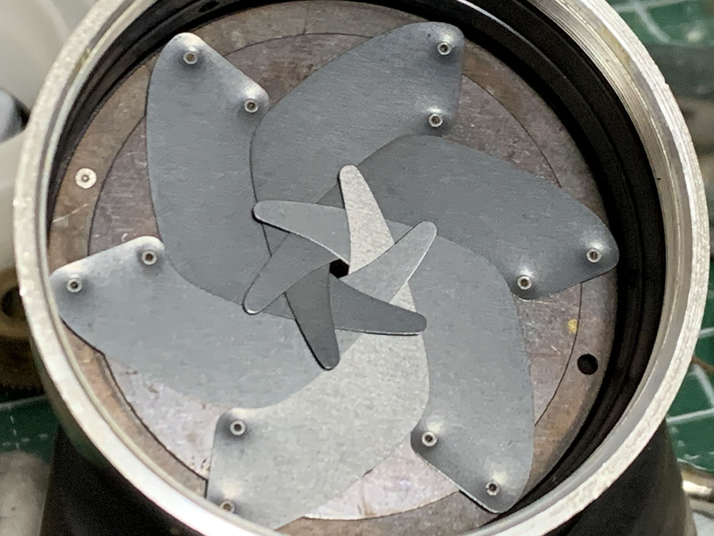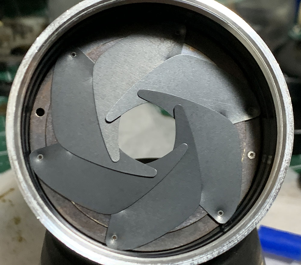Study how the blades were positioned and how the iris mechanism operates. Note that the plates have corroded, this is the reason why the actuation of the iris isn’t snappy. A poor choice of materials resulted in a lens that needs cleaning after a few decades. A poor engineering decision in the name of cost-cutting.