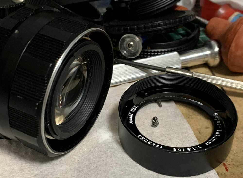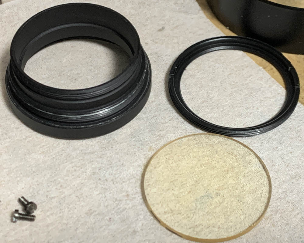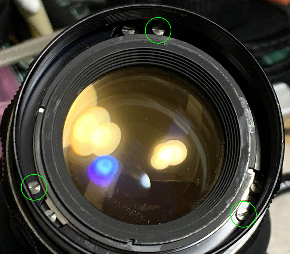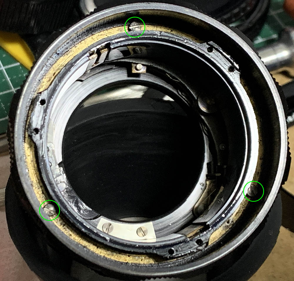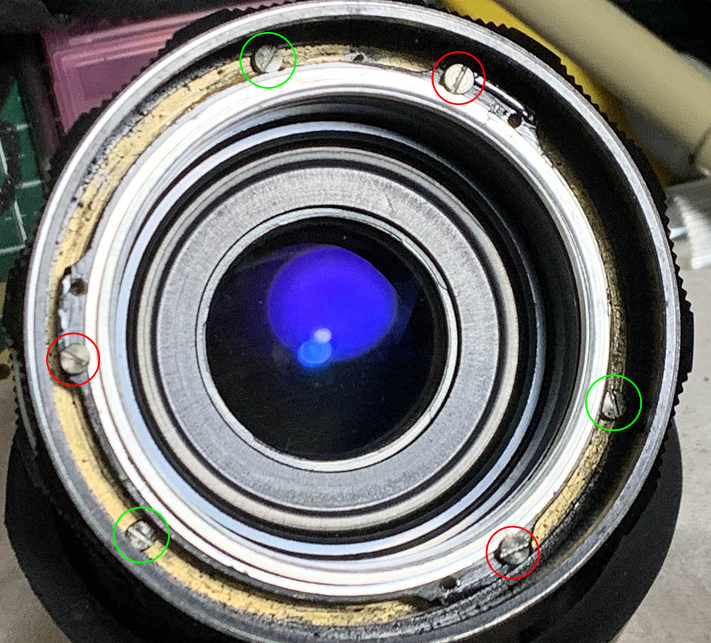 Set the focus to infinity and extract these carefully. There are brass washers underneath each of them so don’t lose any of them.
