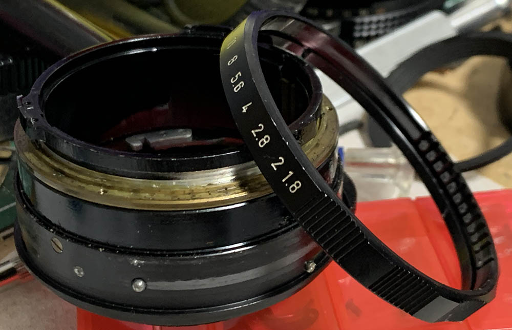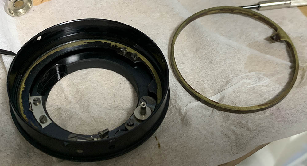 Pull the aperture ring off but be careful not to lose this bearing ball, it’s spring-loaded. Remove it as soon as possible, it should be cleaned properly, too.