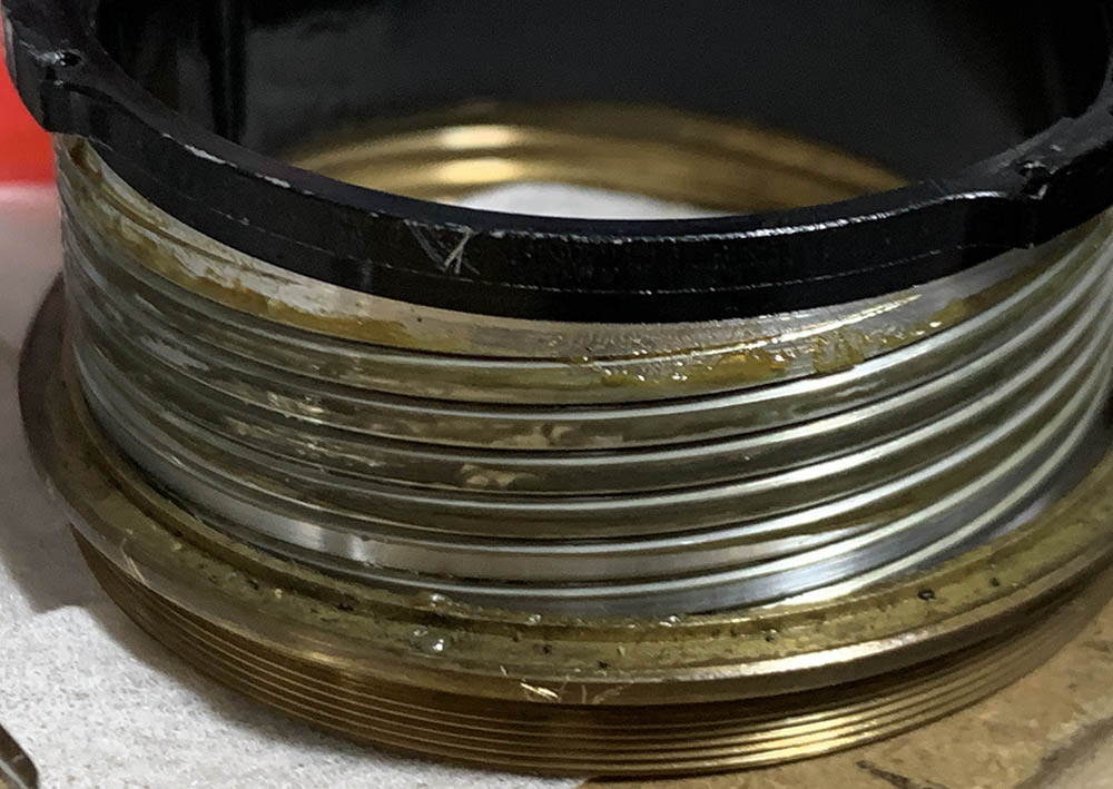 Scrub the helicoids with a strong detergent to remove any old grease then finish them off in an alcohol bath to remove any residue. You’ll want everything to be as clean as possible before you lubricate and reinstall everything. You’ll want to use a type of grease that’s neither light-nor-heavy, only apply the appropriate amount so you won’t end up with the ugly mess that you see here in this article.