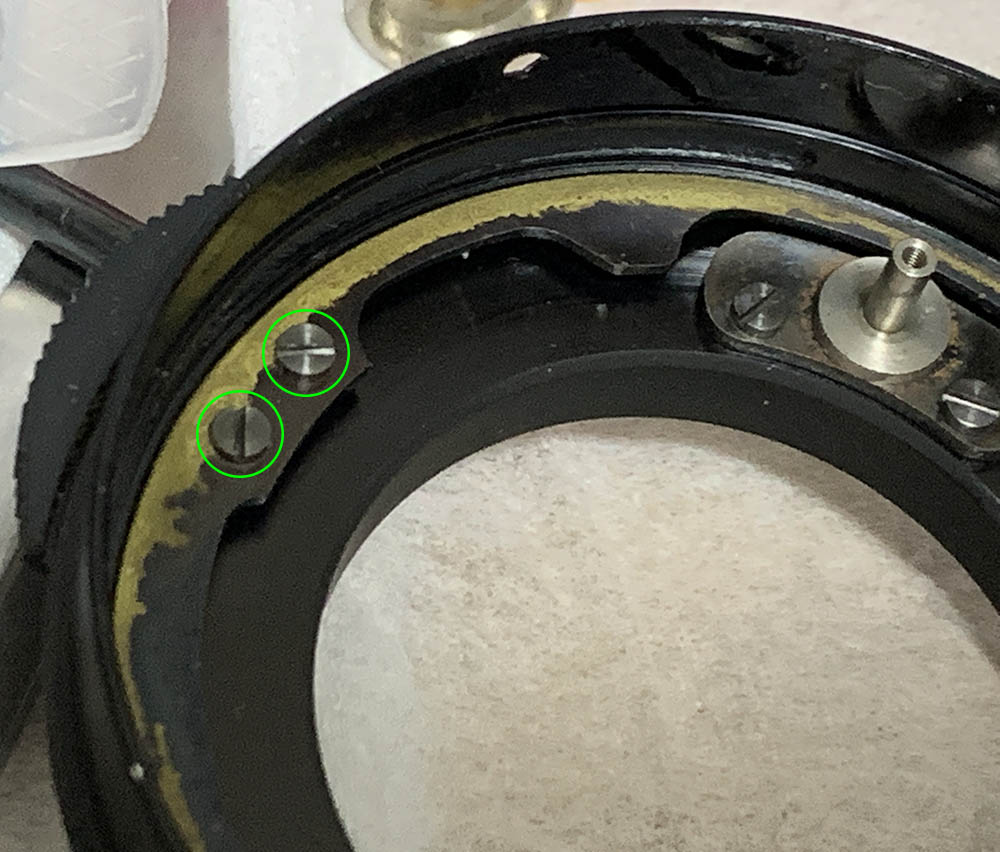 Extract these in order to remove the helicoid keys. Be sure to note which key came from which side so you’ll know how to put them back later. Also note that the screws are not symmetrical, one side is flushed while the other is raised. This is probably done to clear some space for the A/M tab.
