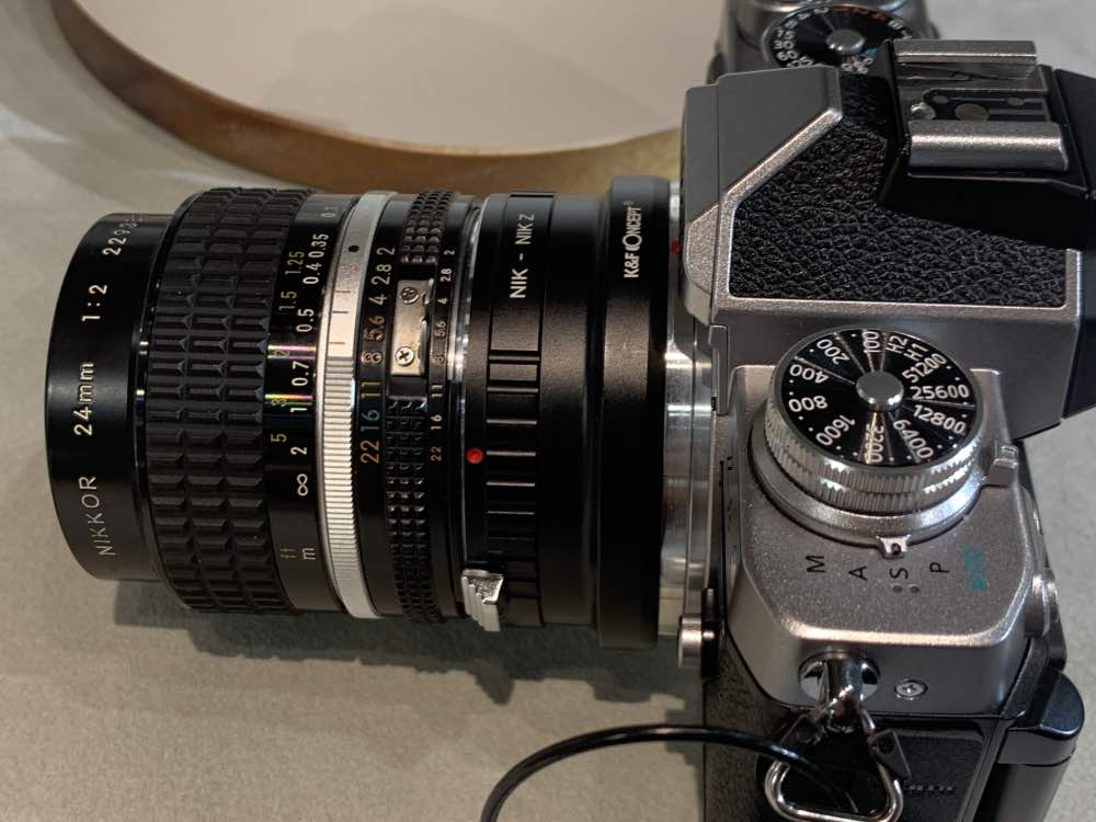 When shooting with an F-mount lens you’ll need an adapter, making the setup rather long. This here is a “dumb” adapter which means that there’s no electronics, a Nikon FTZ will allow some communication with your electronic F-mount lens, it won’t do anything for a manual one except record the focal-length and maximum-aperture, that’s all. It’s better than having nothing at all as in the case of a “dumb” adapter.