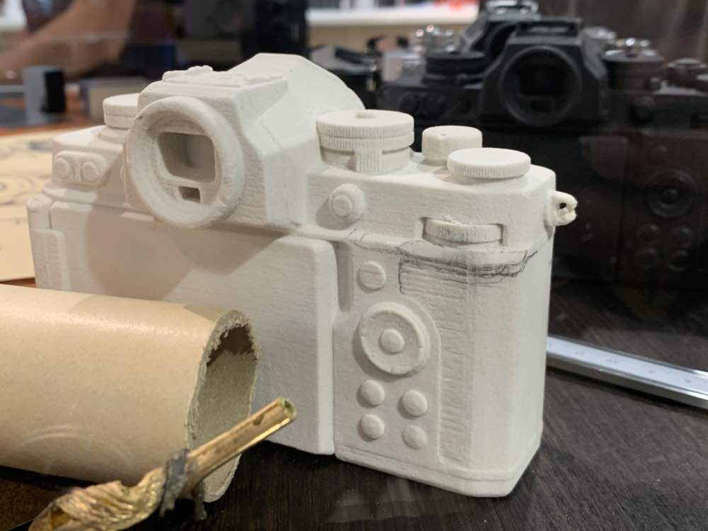 Here’s the rear, it appears that the white mockup is earlier, there are pencil-marks indicating revisions, these were addressed in the black one, you can see that the subtle changes made in the beveling and the shapes or depth of the buttons are different, too. Special attention were made as to the shapes of the levers, even the movie-record button is different between them. If there’s one thing I like about this I’d say it’s how consistent the design is. The other brands’ cameras look “retro” in some parts then transitions into a weird, rounded shape reminiscent of newer designs. It’s ugly and breaks the silhouette, it’s neither angular-nor-rounded. If you want to make a wannabe-design that looks “retro” just go all-out instead of doing it halfway.