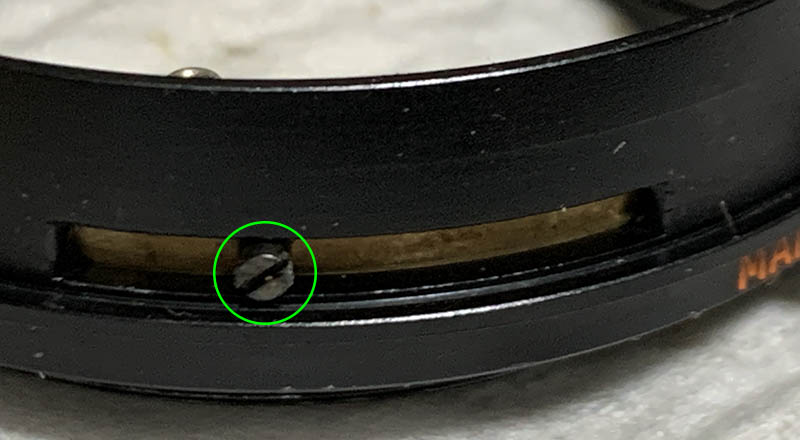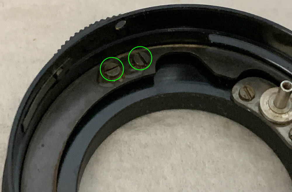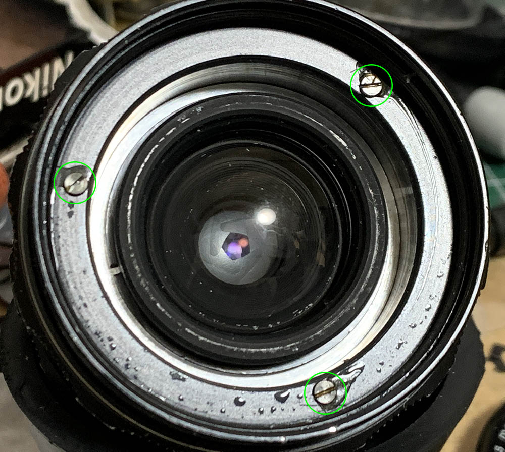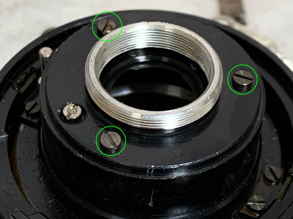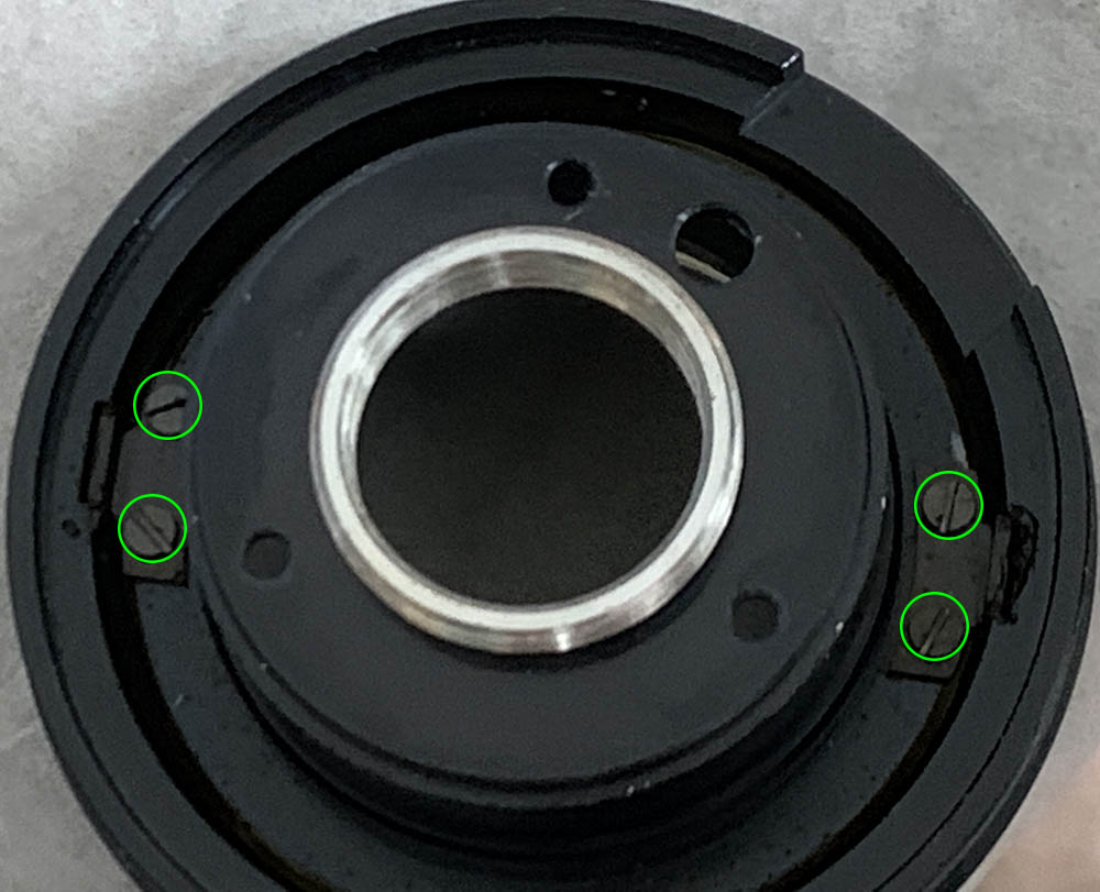 These screws secure the focusing ring. Take plenty of notes before you remove these so you will know the approximate alignment of the focusing ring and the helicoid.