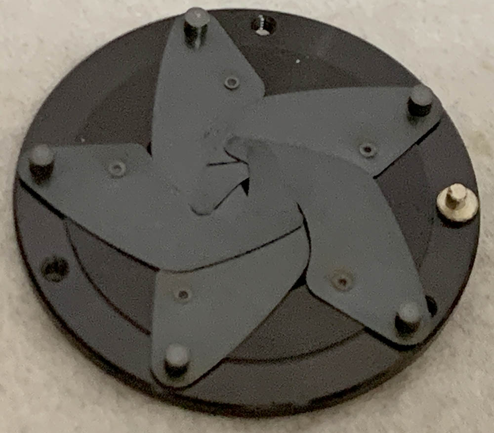 If you’ve extracted the 3 screws earlier you should be able to remove the baseplate of the iris mechanism like this. You should carefully remove the blades so you won’t damage any of them. Only handle the blades by the base and do not warp it.