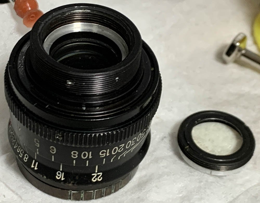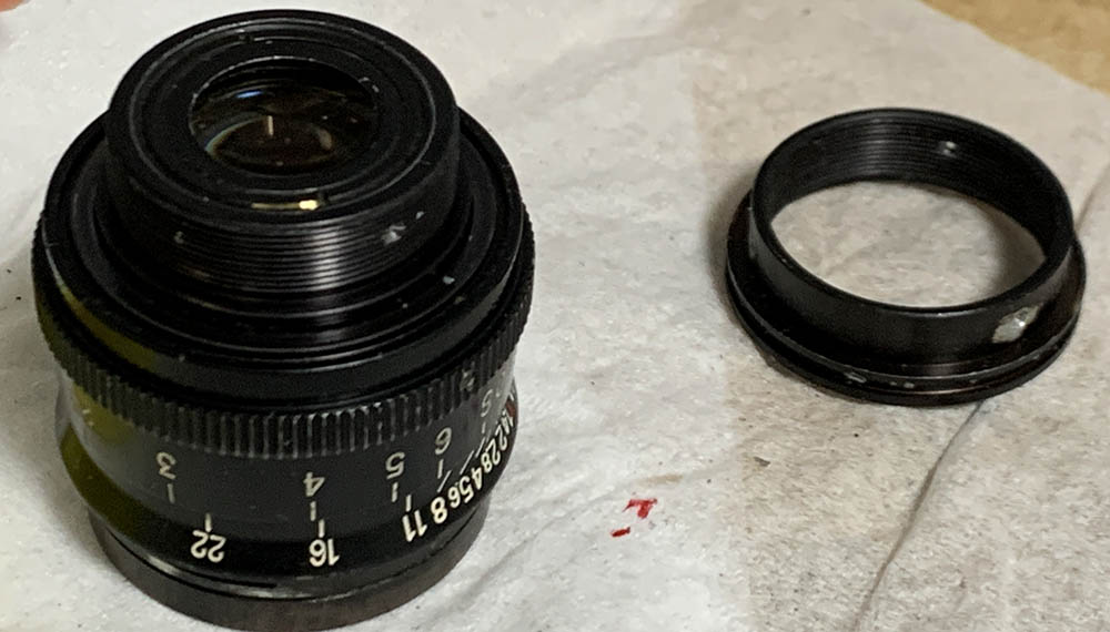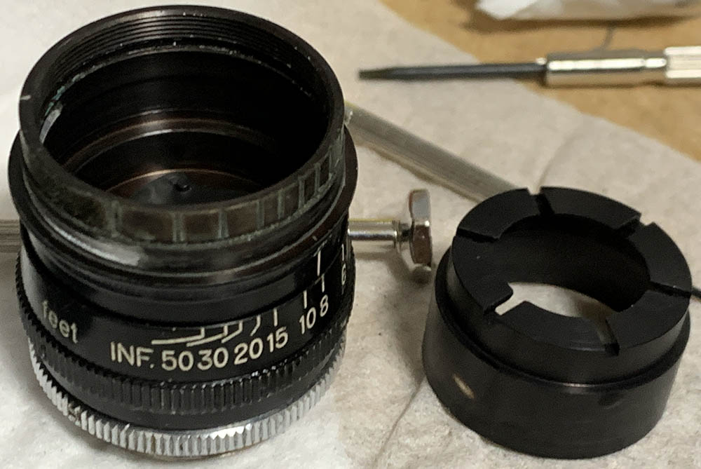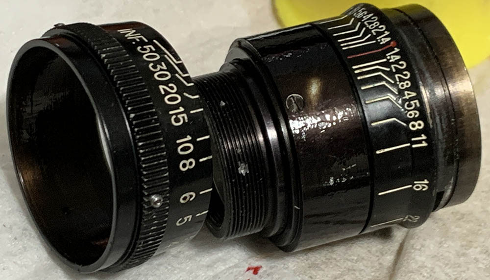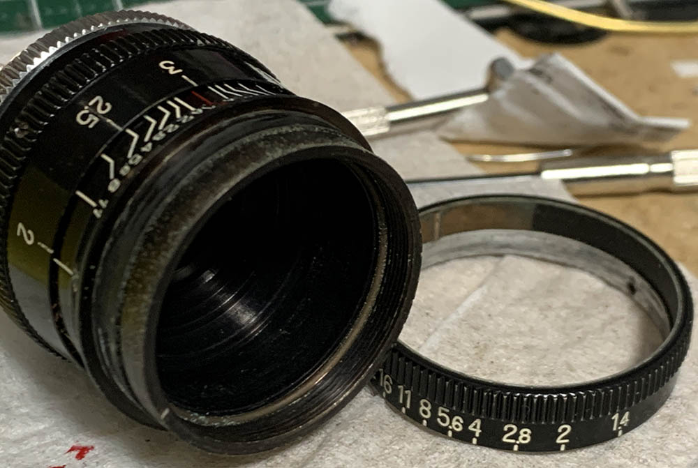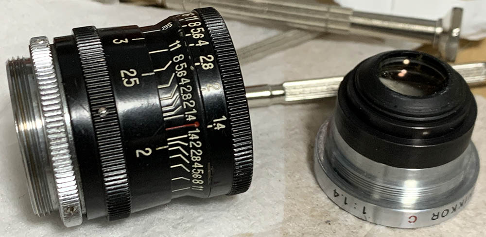 Its construction differs from all C-mount Cine-Nikkors that I know of but it has a lot in common with the small D-mount ones that I’ve covered previously. Like all lenses you will want to separate the optics as quick as possible so you can fix the barrel without worrying about damaging the optics. It’s not difficult to do so with this lens and I’ll show you show it could be done safely in this article. It’s not difficult to service this if you know where to start but I won’t recommend it to beginners. If your lens has to be serviced be sure to send it to a professional.