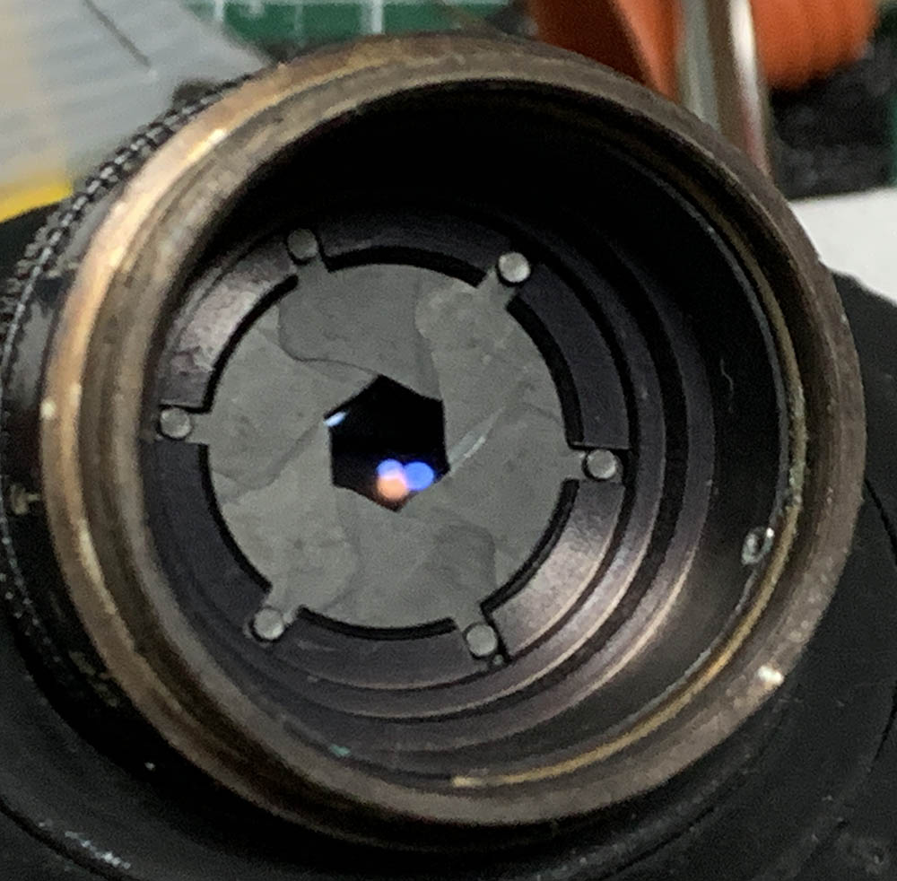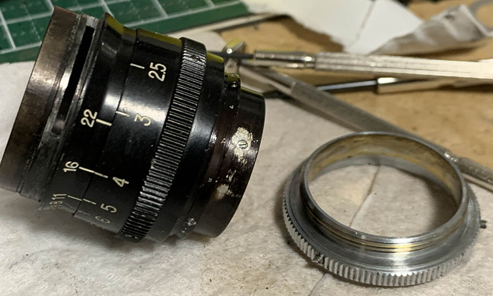 The aperture ring is secured by a brass ring, carefully pick it off to dismantle the iris mechanism.