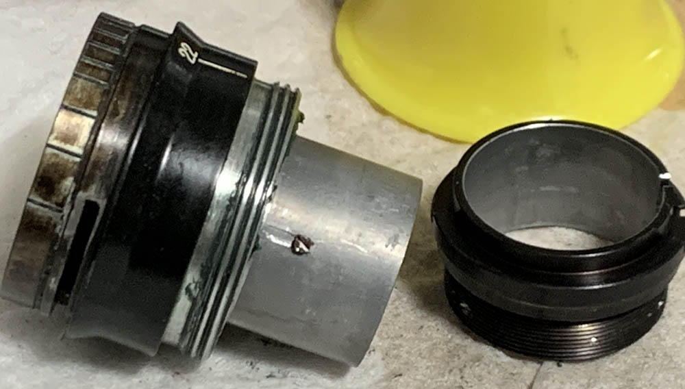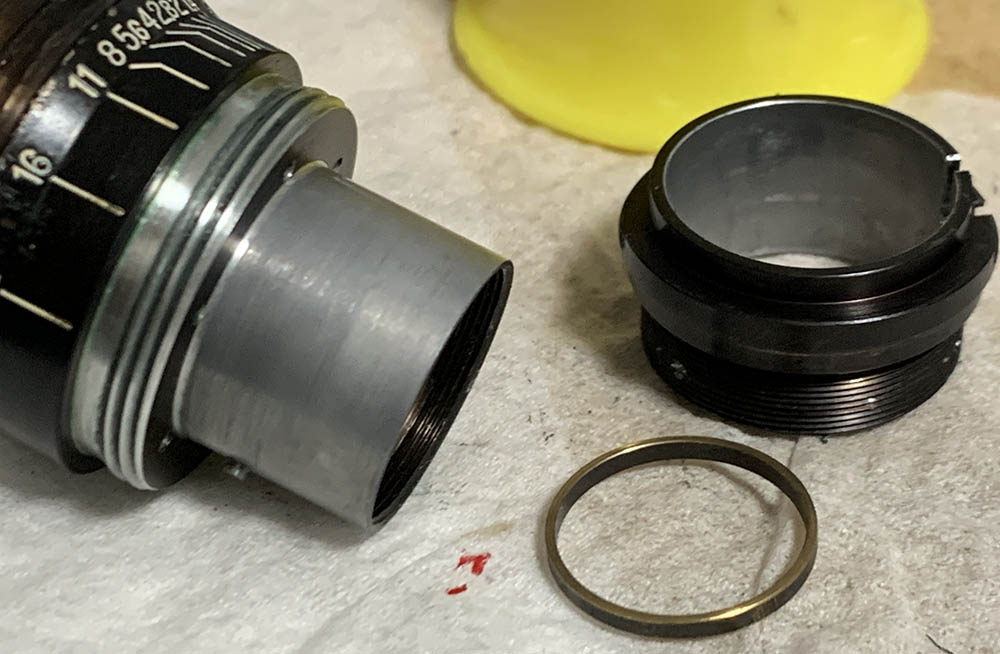 Pull the aperture ring off. Note that there’s a spring in the inner-wall of the aperture ring, you can see it here, it’s a thin brass spring plastered on the inner wall of the aperture ring.