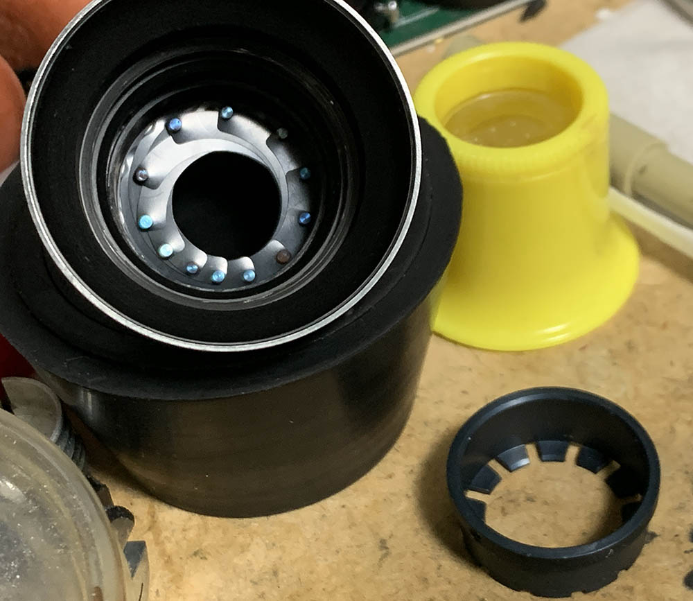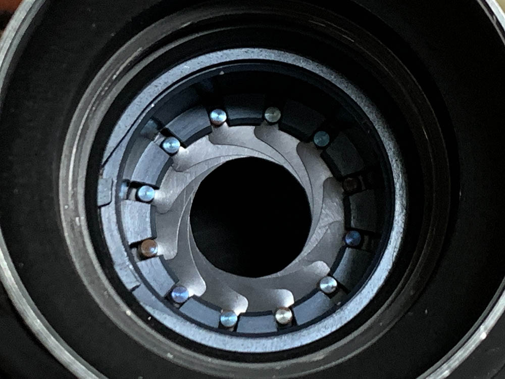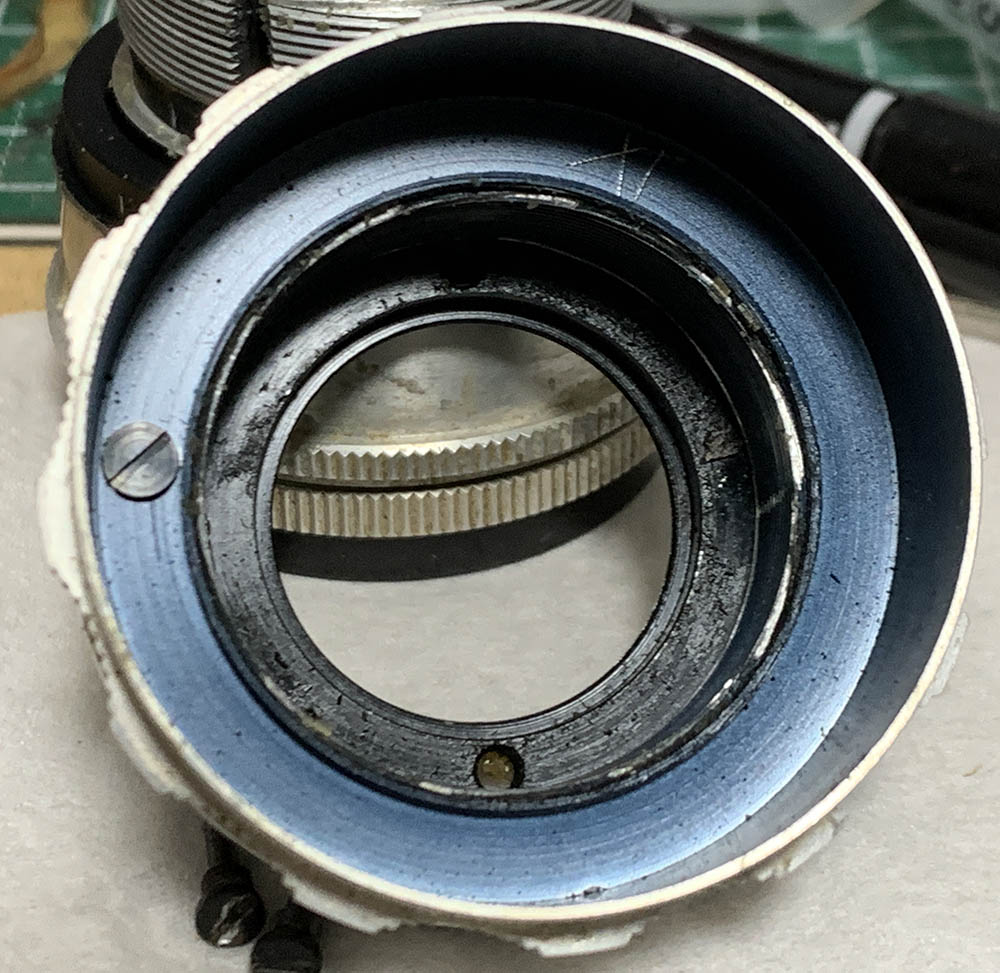 Clean everything very well and do not leave any residue. When putting the rings back it’s best to apply a very thin film of grease, excessive lubrication will migrate to the iris in the future and cause an even bigger mess. The only parts that need lubrication at the threads of the aperture ring and the preset-selector, the slots will also benefit from it, too. You will be surprised at how little lubrication is needed to achieve a smooth feel so don’t overdo it.