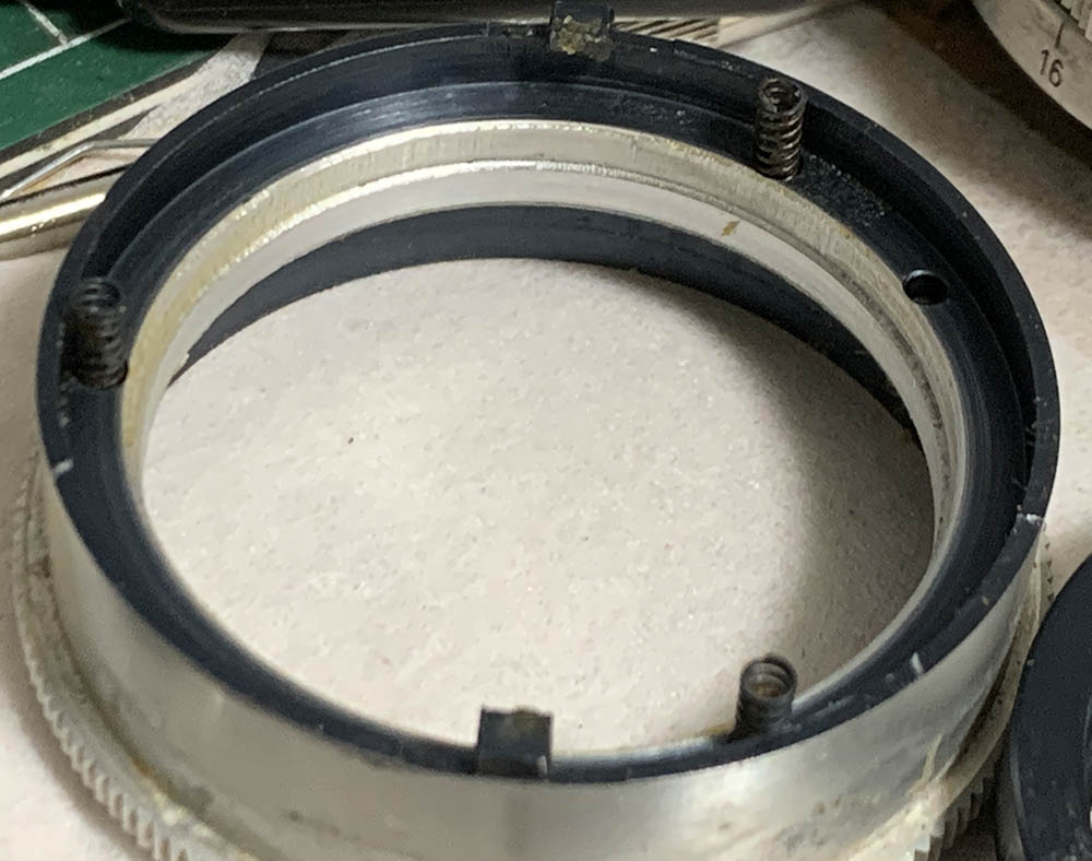 Dismantle the preset-ring assembly by unscrewing its retainer first using a lens spanner then remove all of its parts. Be careful when removing anything since it’s spring-loaded.