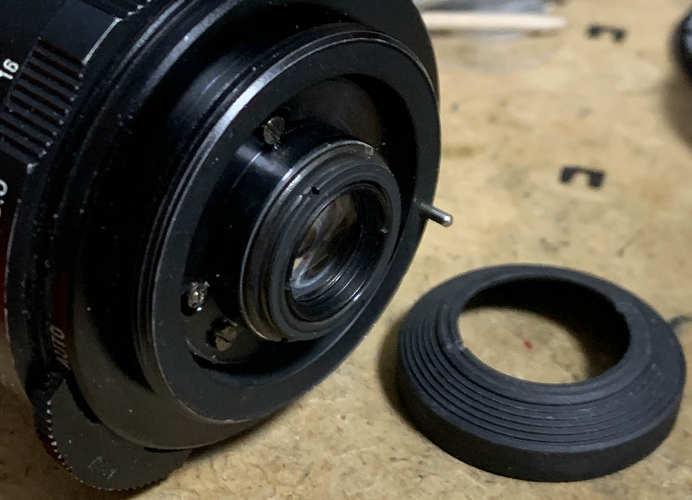 There’s a collar here that secures the iris mechanism, unscrew it with a lens spanner. Mine was sealed at the factory, it’s important to dissolve the seal first before you unscrew this. You can also see 2 screws here that secures the arm, extract them and remove the arm before you proceed.