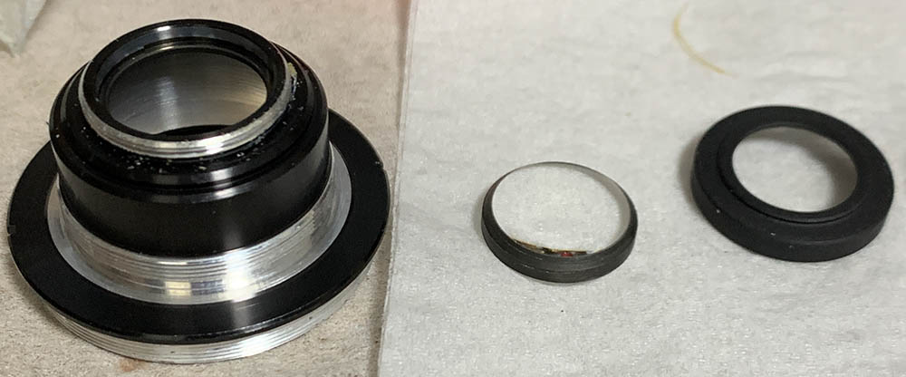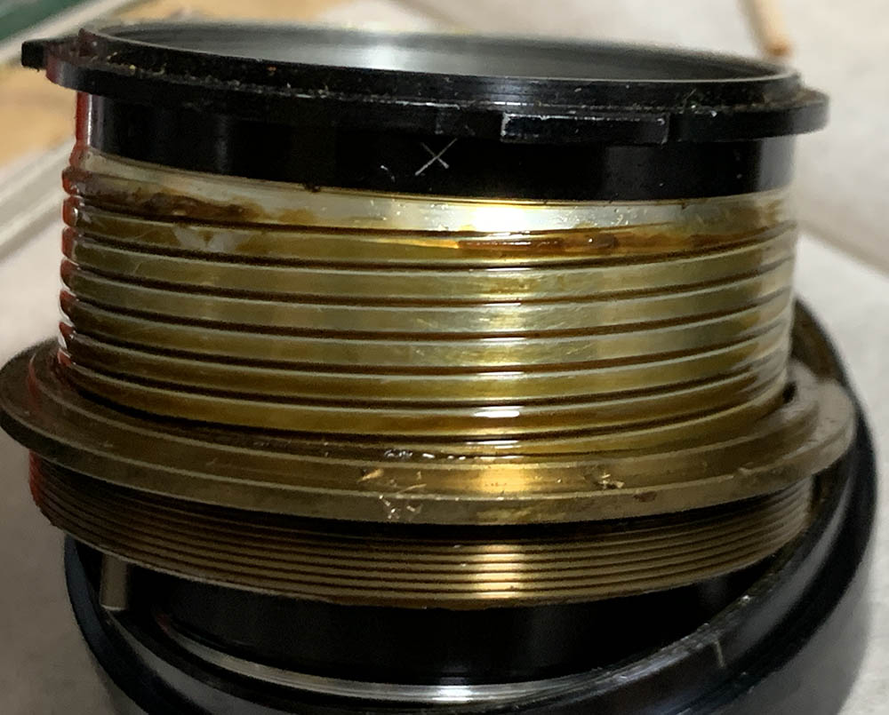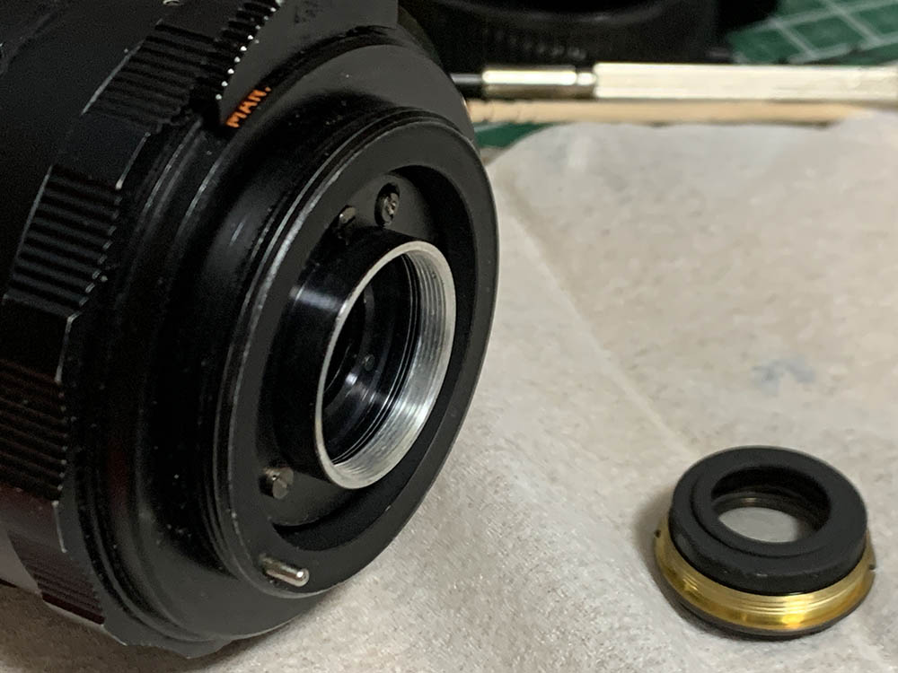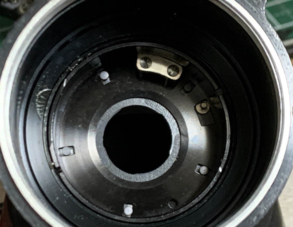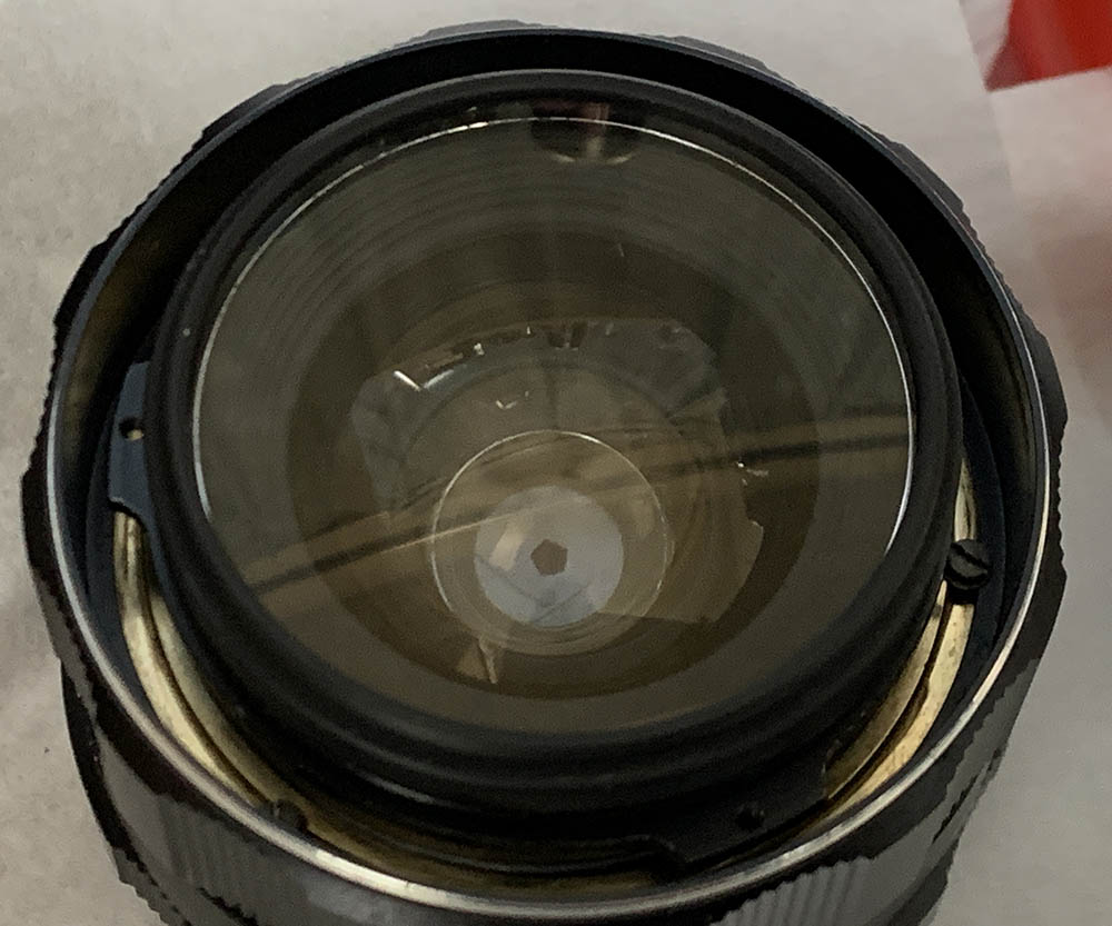 Fortunately the internal fungus was present only on the external surfaces of the front & rear optical assemblies where they meet at the iris – and could be cleaned in a pinch by removing just the rear group assembly and opening up the aperture to carefully access the rear element of the front group for cleaning.