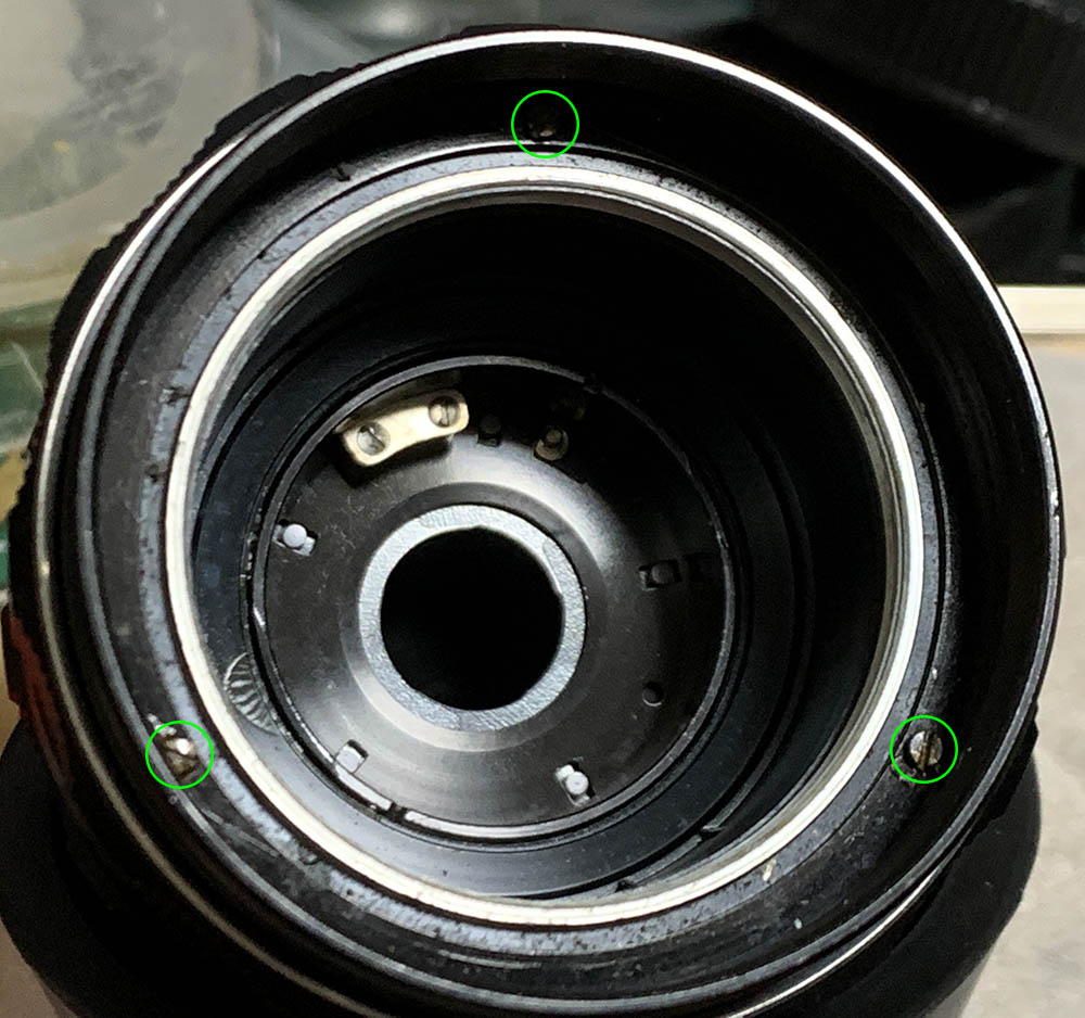 Before you continue, set this to infinity and be sure to make small marks so you’ll know how the focusing ring should be aligned. Be sure not to disturb the helicoids from here on so you’ll have a point-of-reference. Once you’re satisfied with your notes extract these screws to remove the focusing ring.