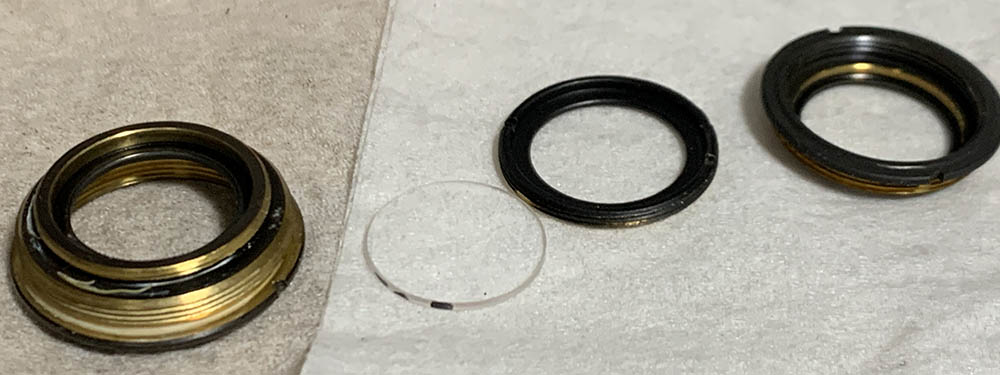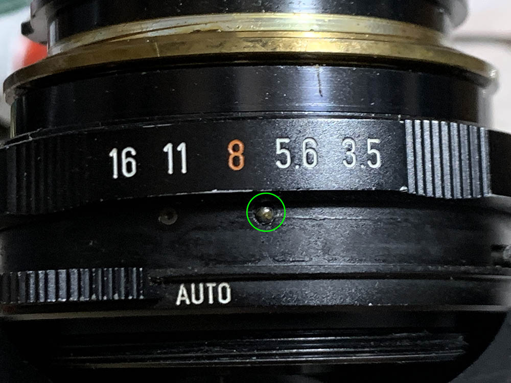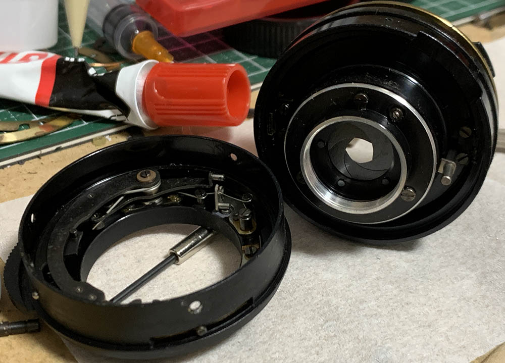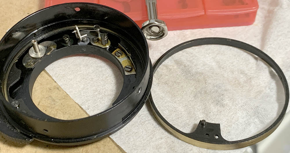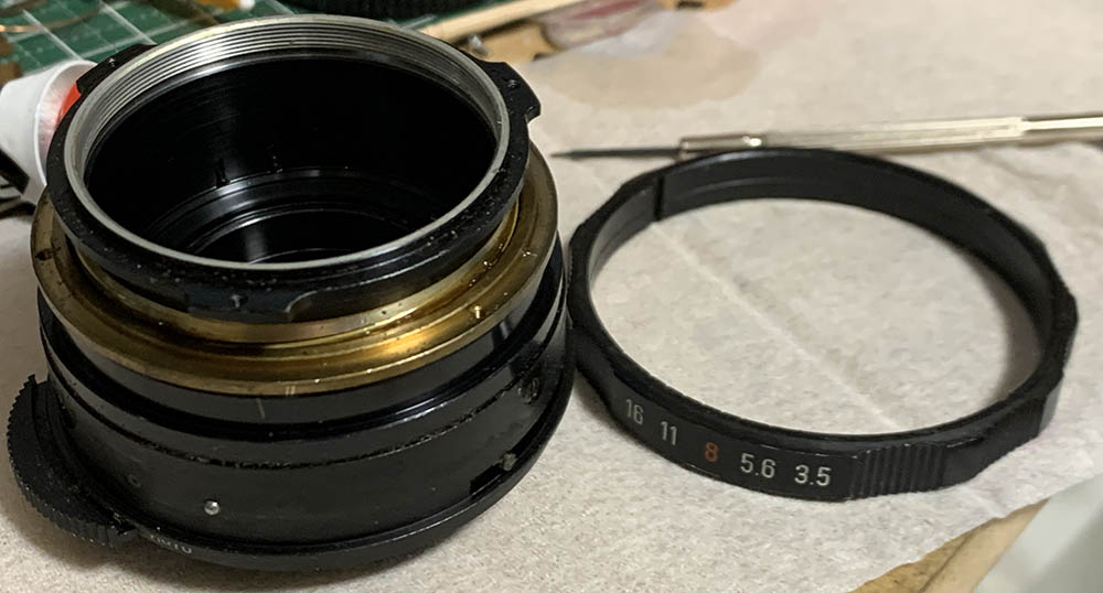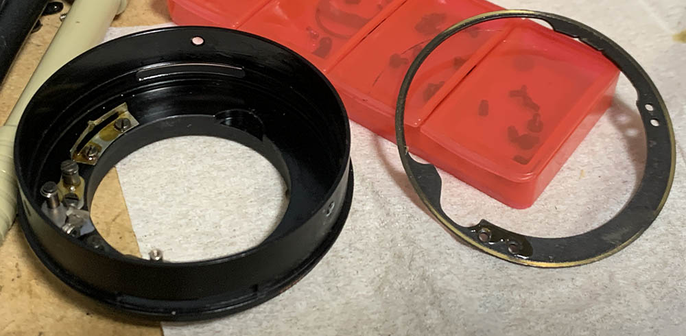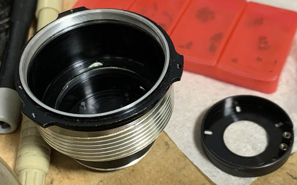 Be careful when removing the aperture ring, there’s a spring-loaded pellet underneath it. Extract this and store it inside a secure container after cleaning it. This is used for the detent-clicks, they’re usually greasy.