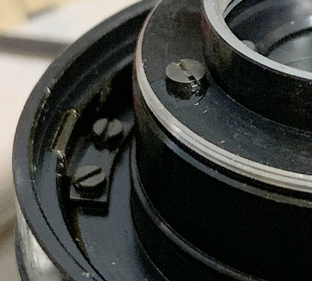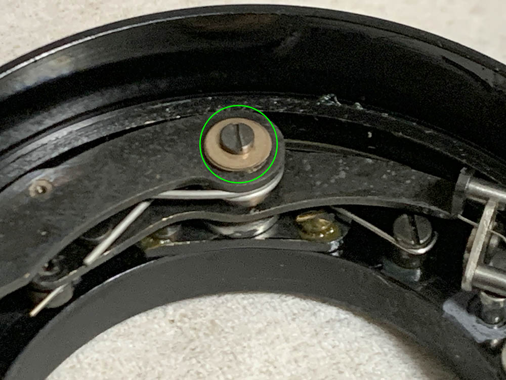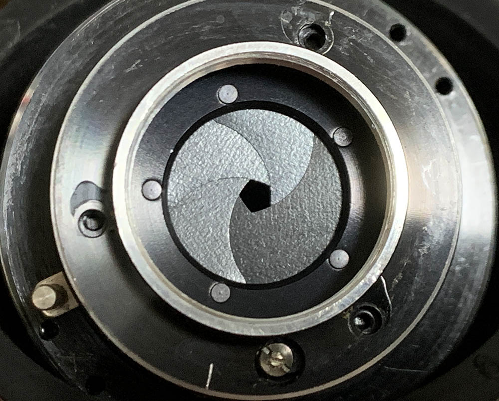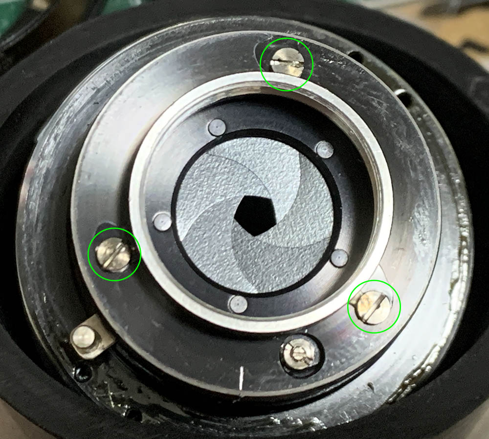 These screws secure the iris mechanism’s plate, do not extract these until much later. I removed them too early but I’m lucky that the plate is secured-tight. The eccentric here should never be adjusted or removed, note its position so you will know how the plate should be adjusted later.