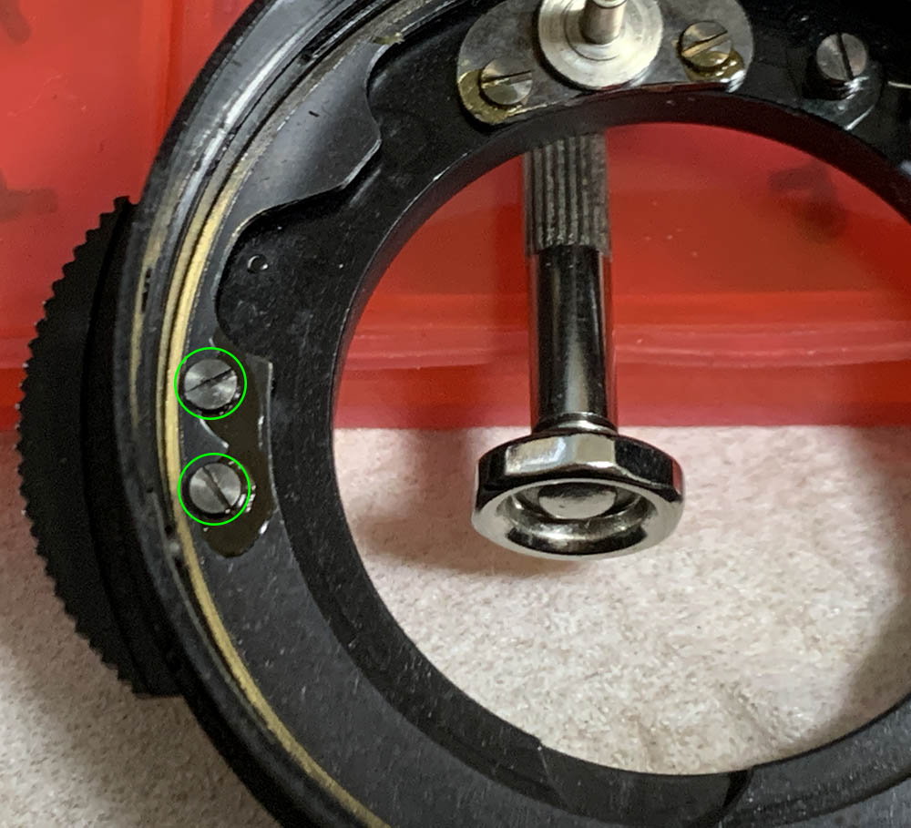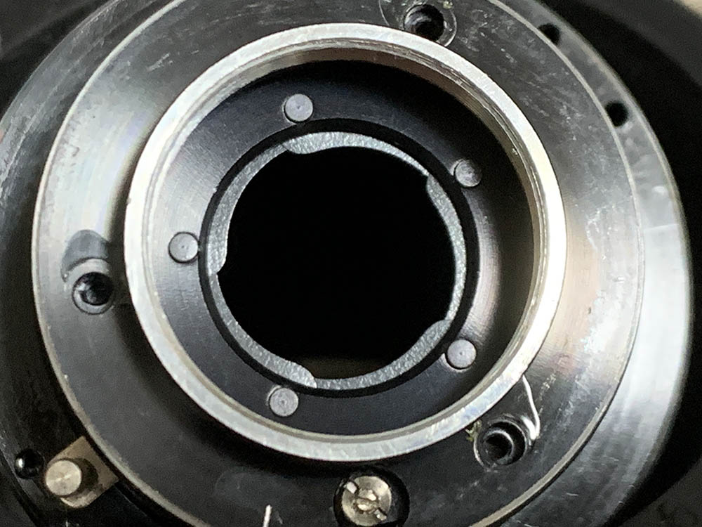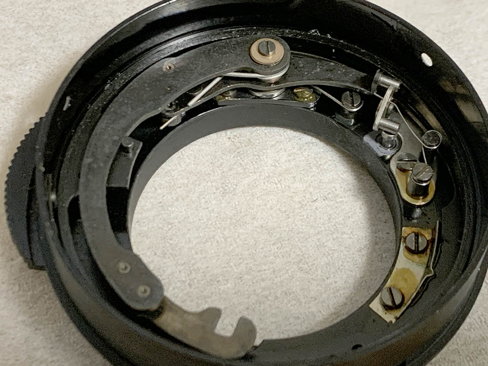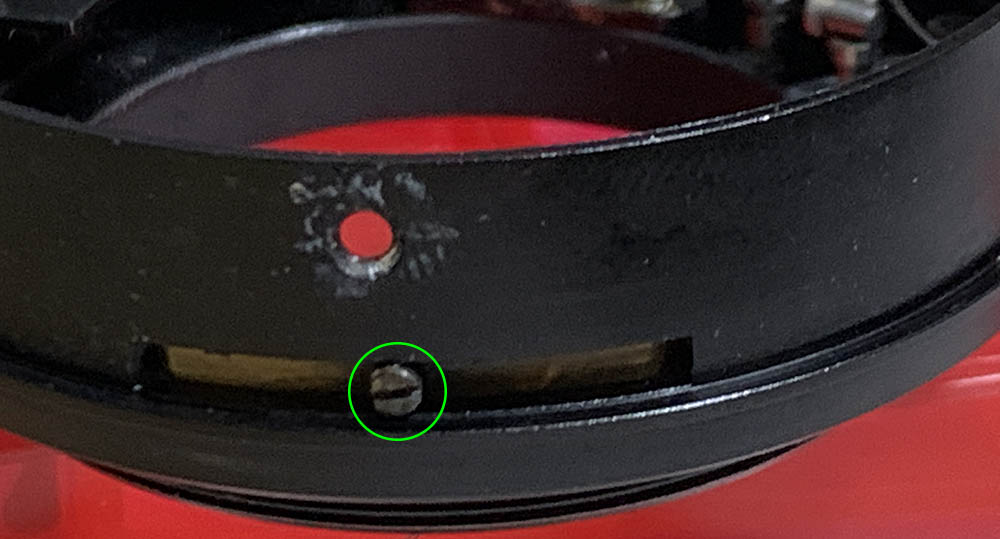 These screws secure the iris mechanism’s plate, do not extract these until much later. I removed them too early but I’m lucky that the plate is secured-tight. The eccentric here should never be adjusted or removed, note its position so you will know how the plate should be adjusted later.