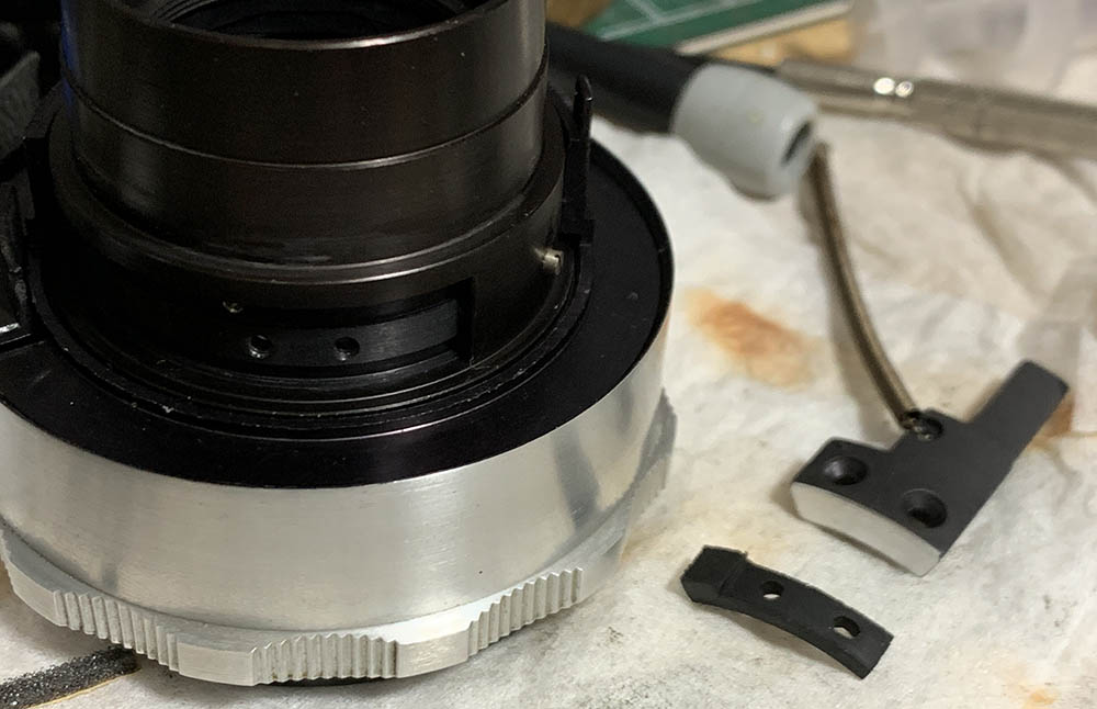 Overhauling the iris mechanism takes the most time, you’ll probably spend about an hour putting the leaves back. It’s a tedious job but I’m used to it. Putting the spring back can be very tricky, you’ll have to reinstall the rail first before you will be able to put the spring back. This requires a lot of dexterity and patience.