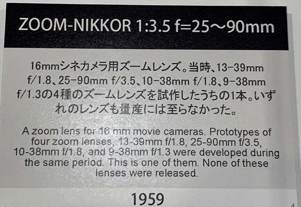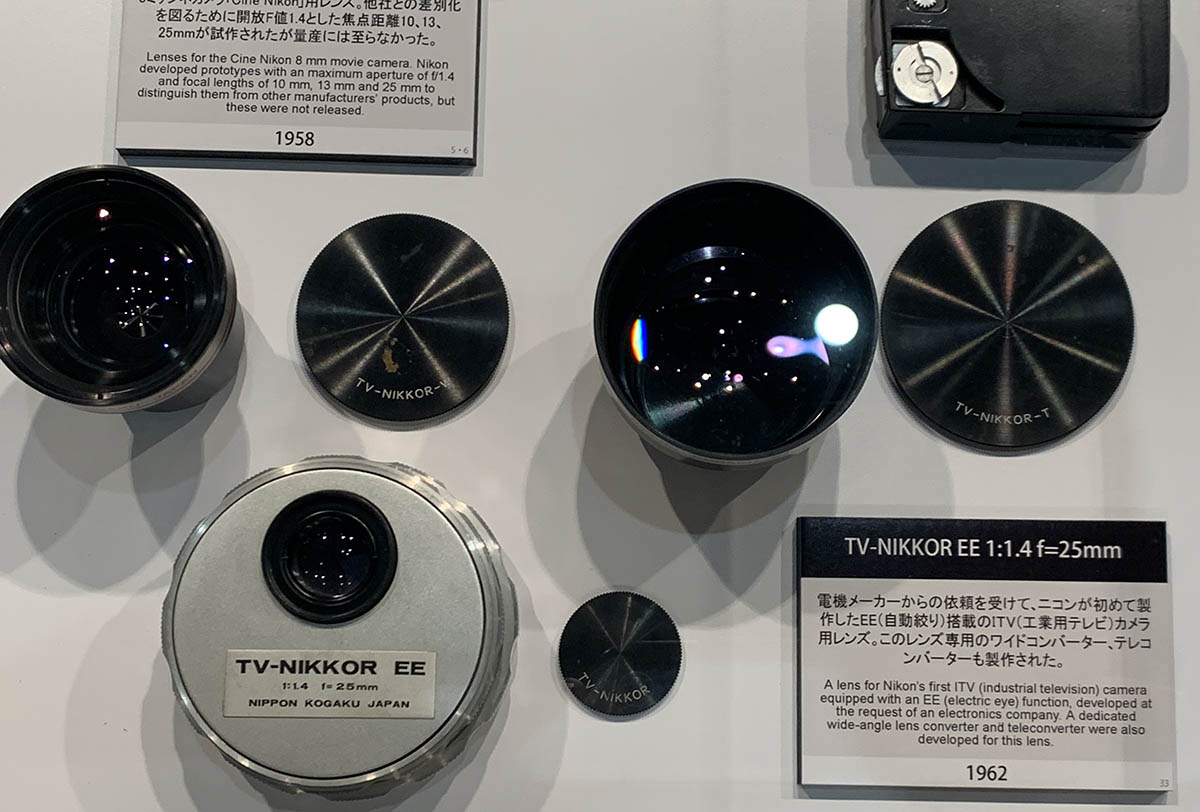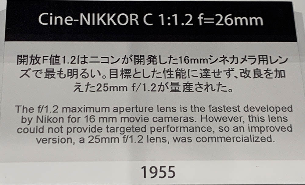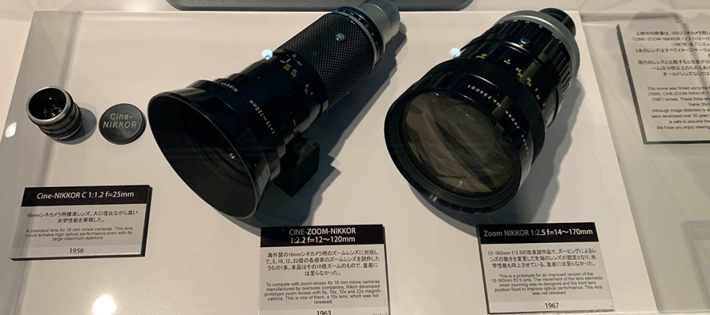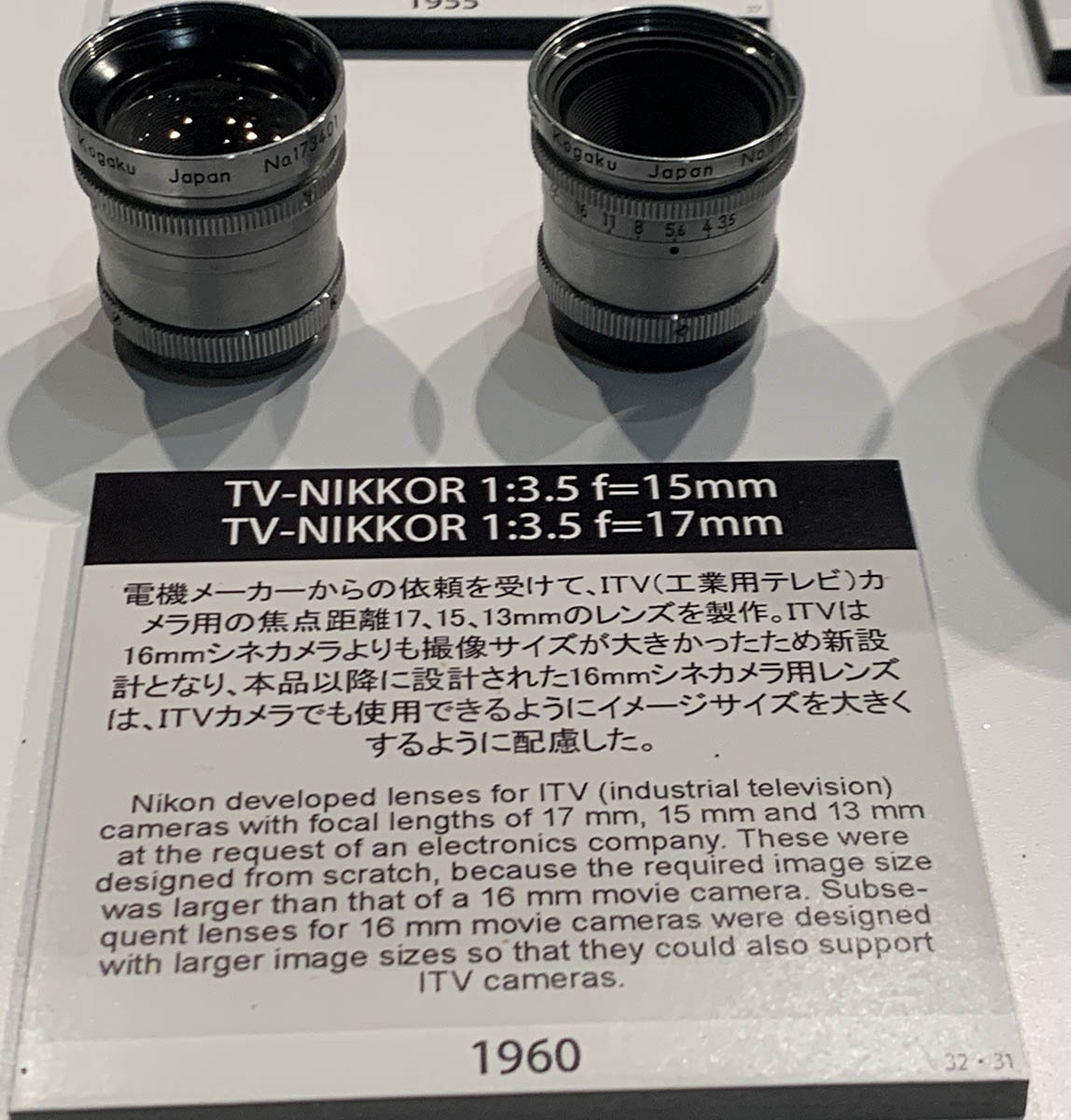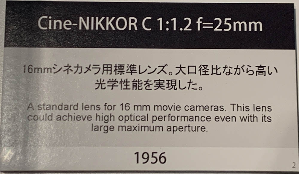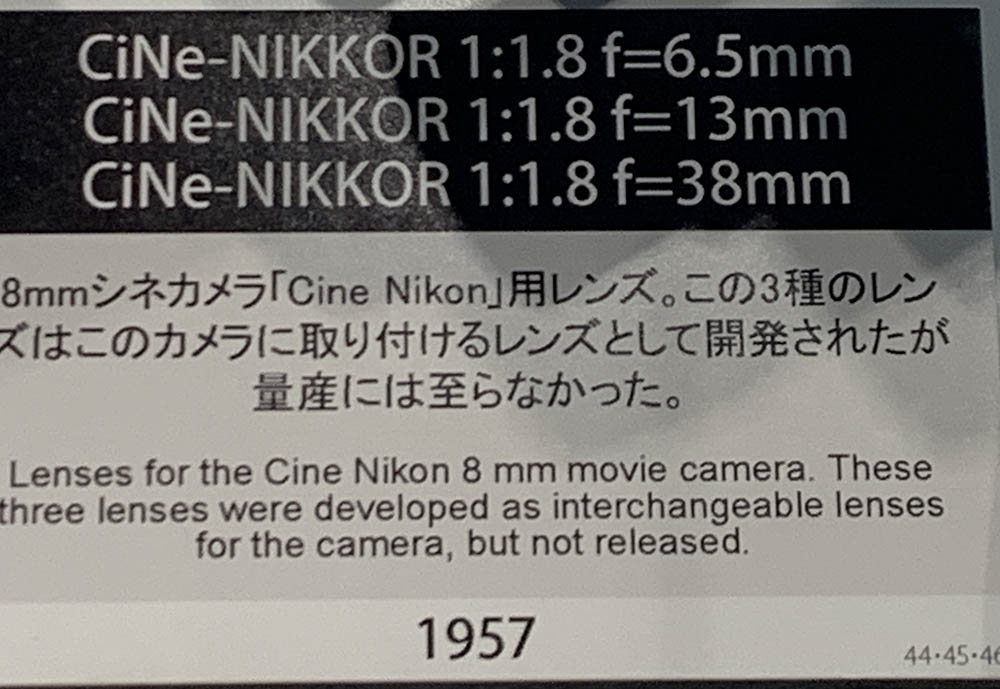 This part of the display shows the origins of the C-mount Cine-Nikkors that I’ve been writing more about recently. This is an eye-opener for me because I never knew when these were made and for how long, at least I now know when the series began. It is safe to assume that there are 2 main eras for C-mount Cine-Nikkors, ones that came before this line and the ones that came after. This is where these Cine-Nikkors began to look more modern.