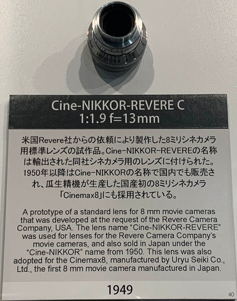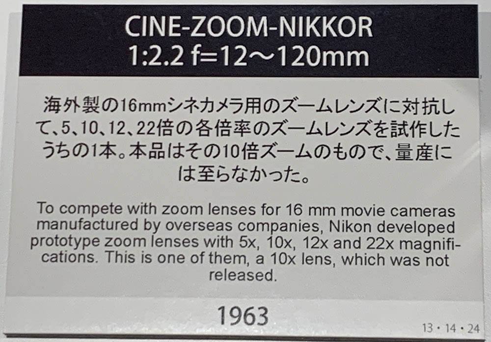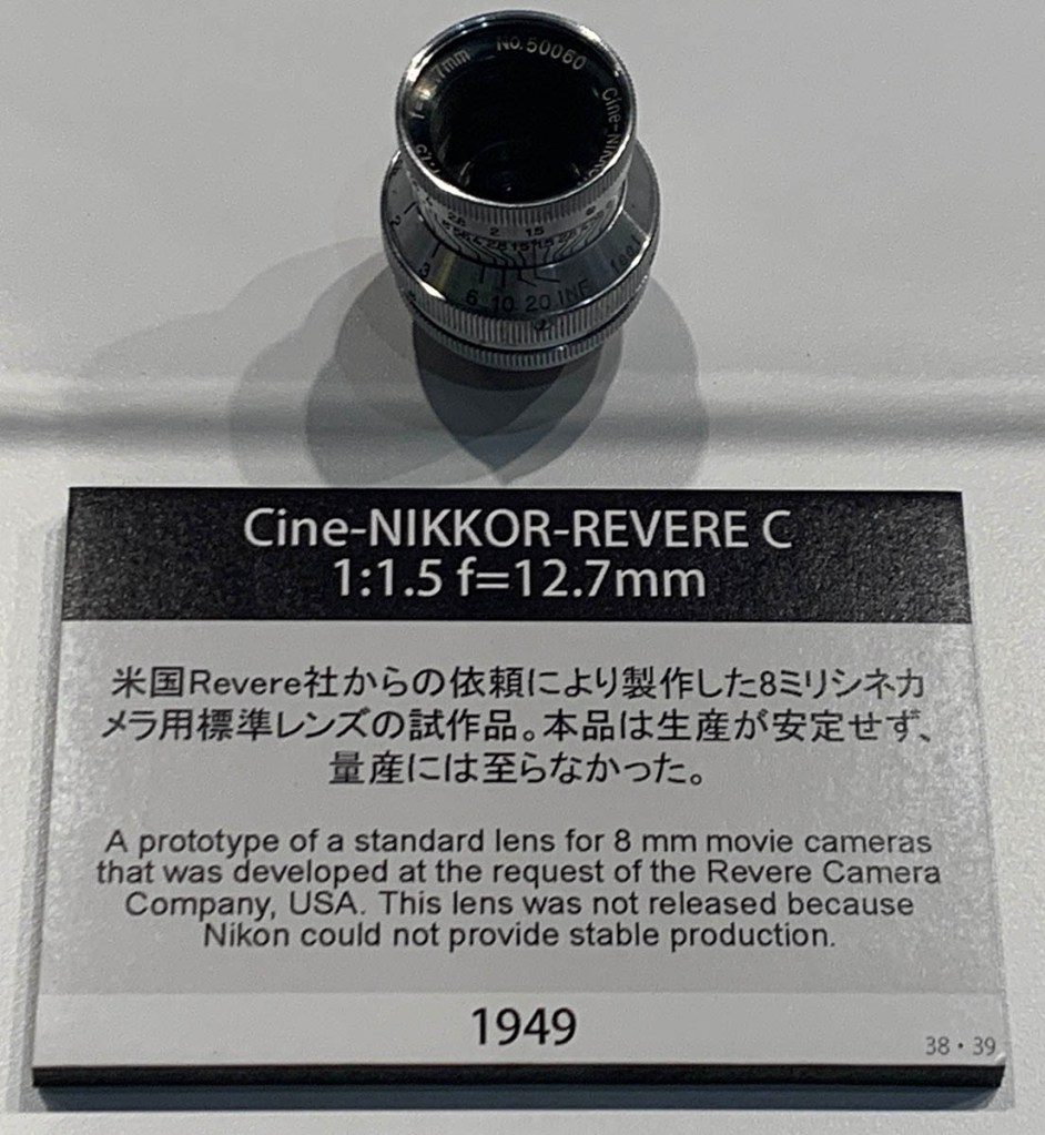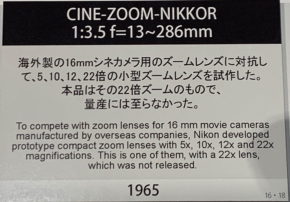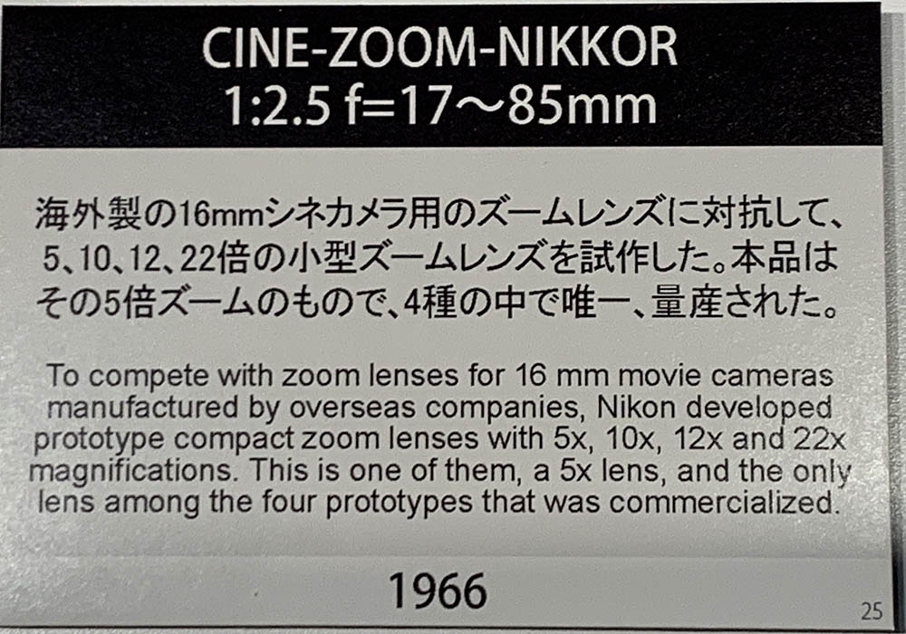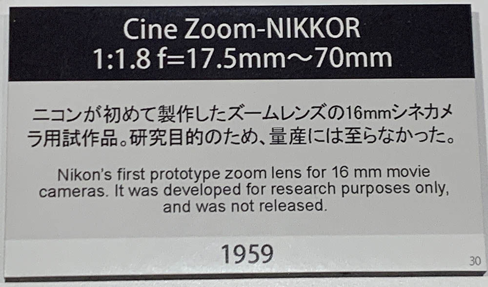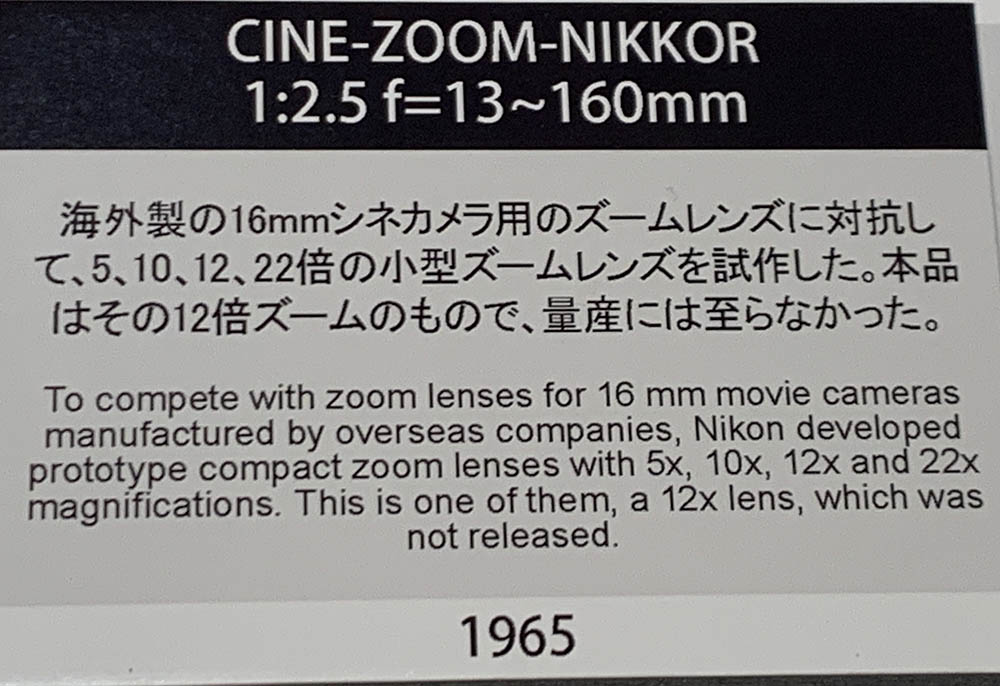 This part of the display shows the origins of the C-mount Cine-Nikkors that I’ve been writing more about recently. This is an eye-opener for me because I never knew when these were made and for how long, at least I now know when the series began. It is safe to assume that there are 2 main eras for C-mount Cine-Nikkors, ones that came before this line and the ones that came after. This is where these Cine-Nikkors began to look more modern.