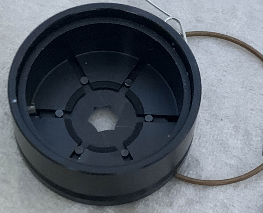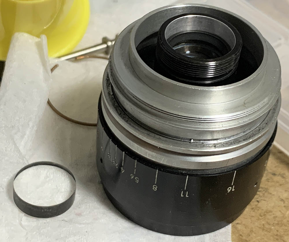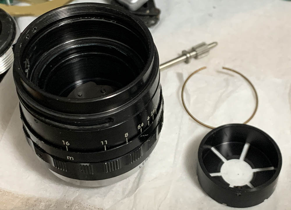 Study how the iris mechanism works by gently operating it. There’s a brass clip here that you will have to remove in order to dismantle the iris mechanism.