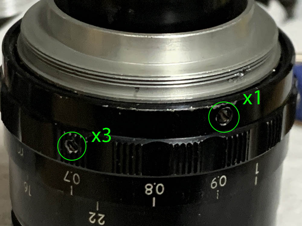 Loosen these screws so you can remove the housing of the iris mechanism. I could have waited until this point before but I wanted to dismantle the iris mechanism early in order to keep the leaves safe.
