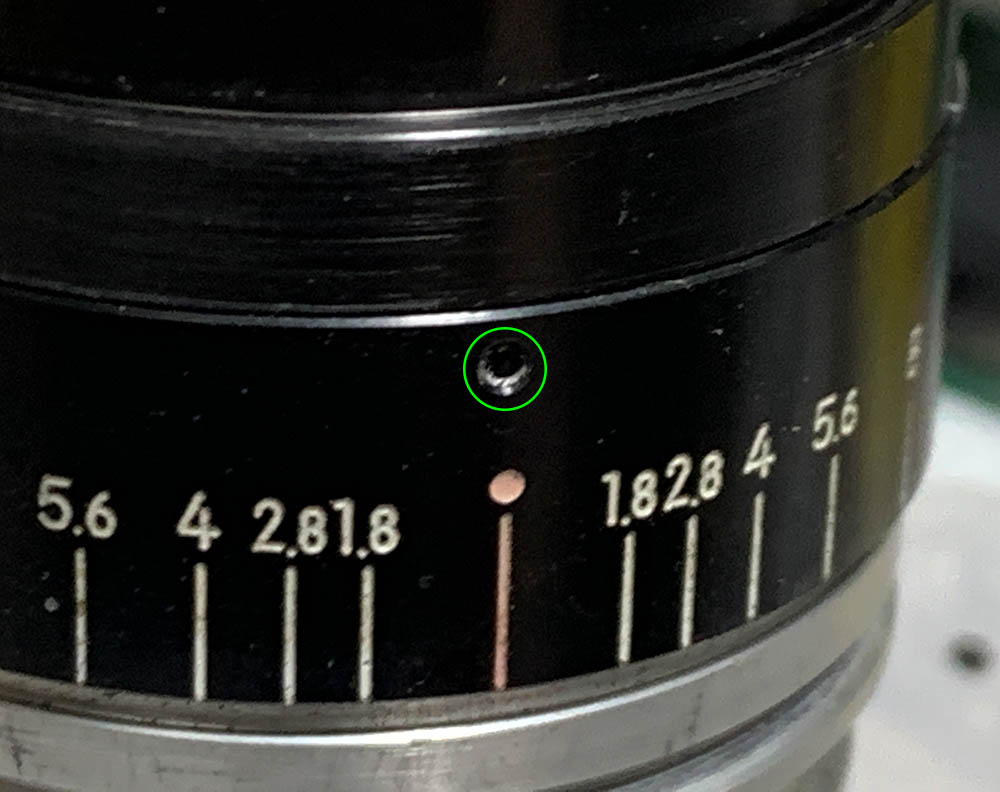 Carefully extract this to remove the aperture ring. It serves as a pin to couple the aperture ring to the iris mechanism. If this is stuck you simply apply some alcohol to its threads in order to soften the seal.