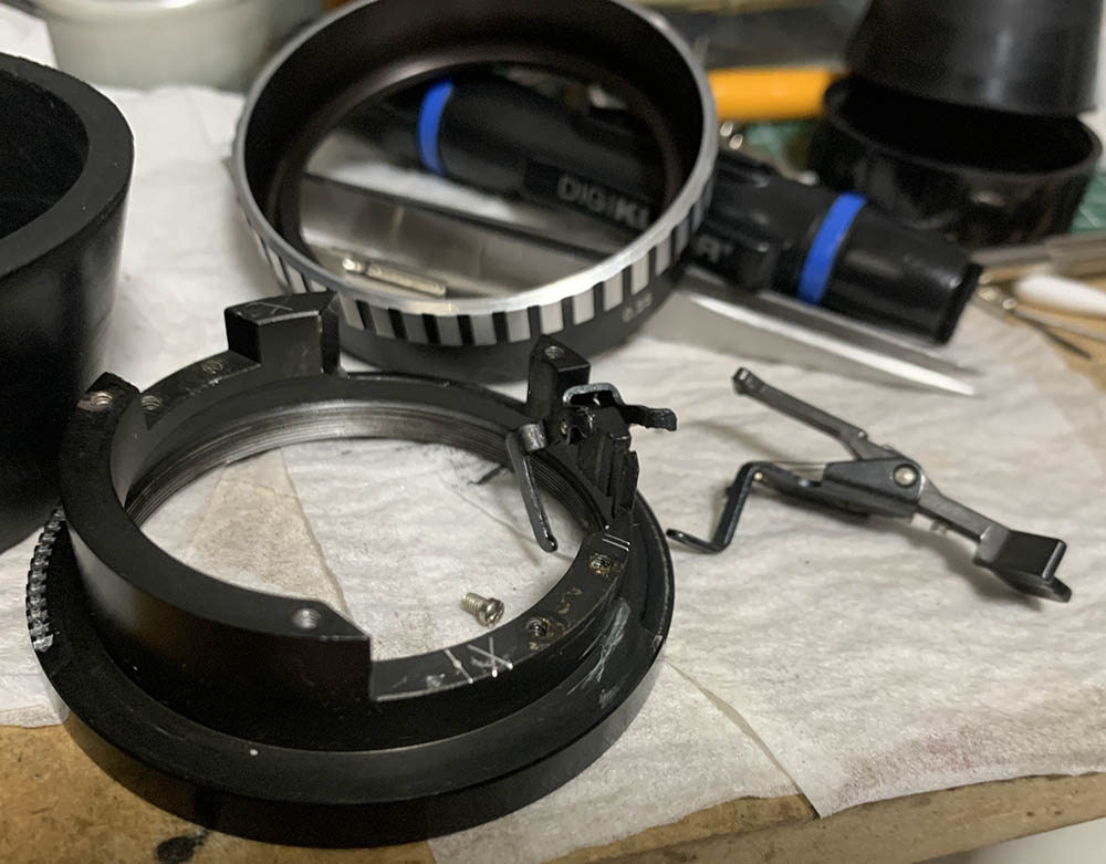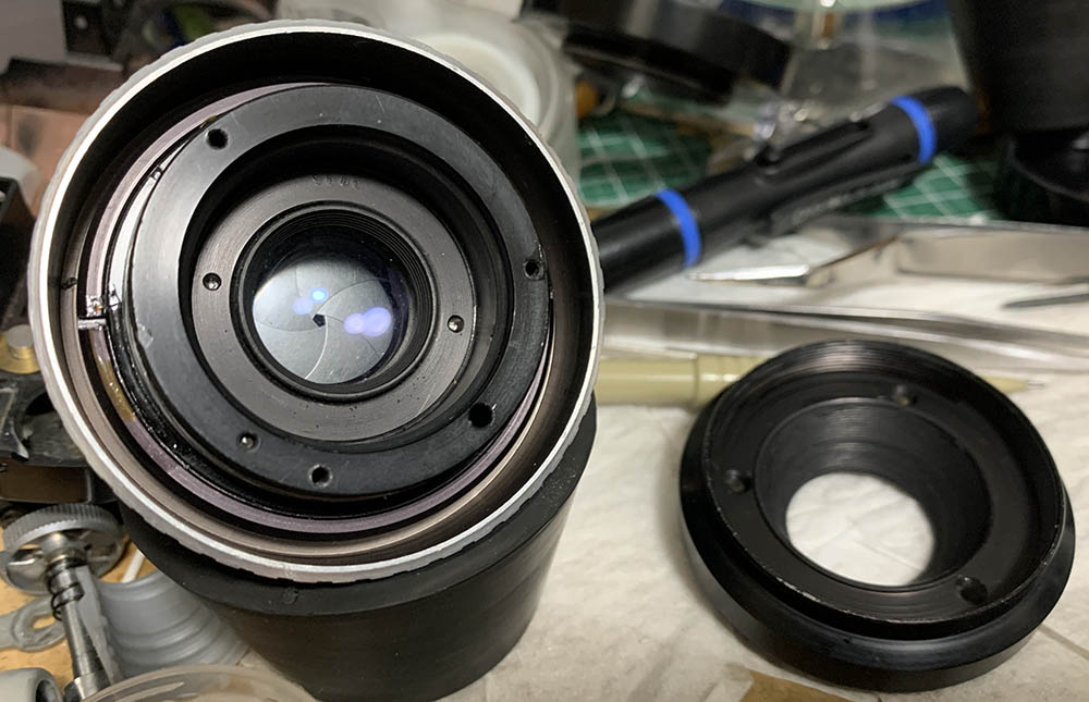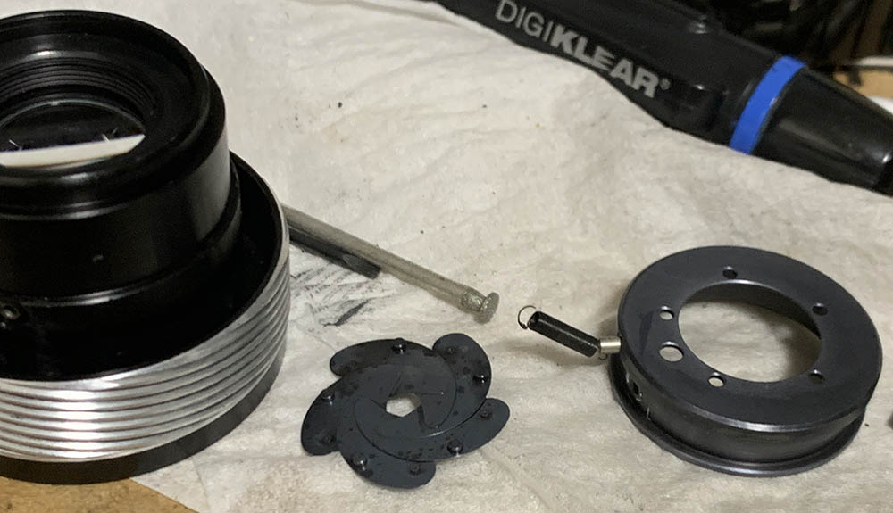 This is the right way to dismantle the iris mechanism. You’ll have to be very careful here because some of the parts are adjustable and you should be able to put things back correctly after the overhaul. Do not merely flush the iris mechanism if it’s oily, the only way to remedy this is a thorough overhaul or it will get oily again soon.