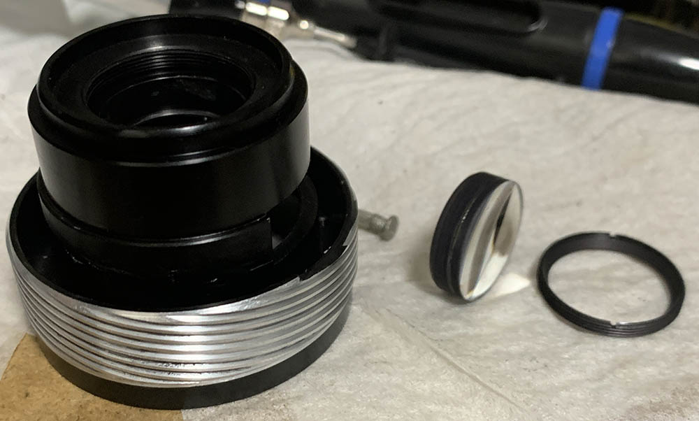 Unscrew the housing of the objective and never forget to note where it separated because this is also the same place where they should mesh. Many people forget to do this so they spend a lot of time guessing the correct position. I’ve written an article on servicing helicoids and be sure to read that so you will know how this is done.