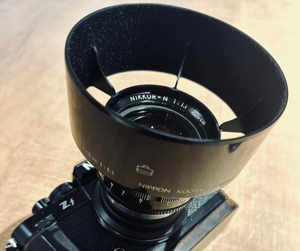One of our dear readers shared this photo of his hood. This is the original one, not the reproduction that was made more than a decade ago. This is an expensive accessory because of its rarity and fragility. If I’m not mistaken, there are 2 versions of this – a plastic version and a metal one. If you are shooting this with a mirrorless camera like the Nikon Zf a cheaper solution is to use a step-up-ring and a much larger hood for telephoto lenses. It ain’t pretty but at least it’s cheap. You will have to be careful though because the thread of the ring may have a slightly different thread pitch from the lens, attaching that will damage your lens.