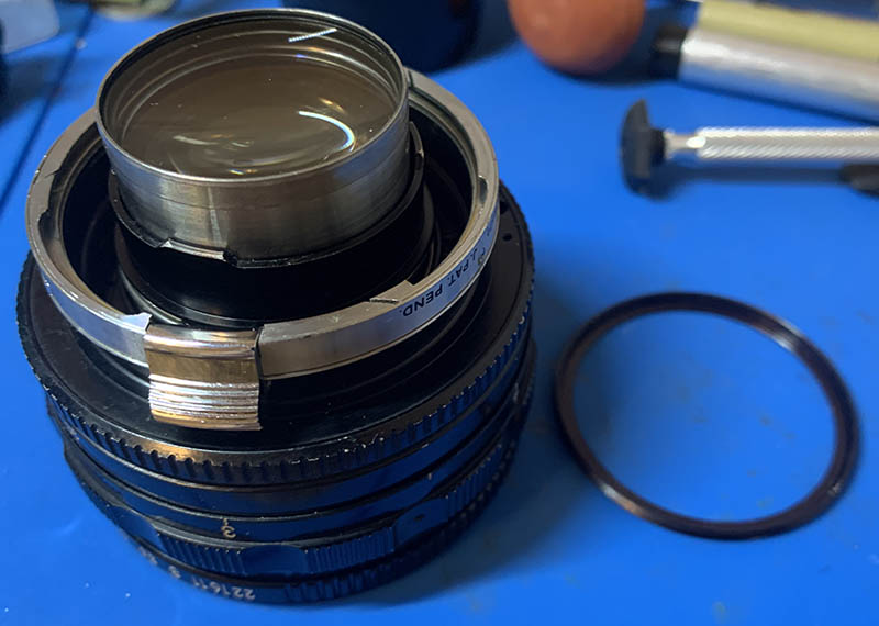 The front element can be accessed by extracting this and turning the front ring off, I left mine alone since my lens is not dirty anyway.