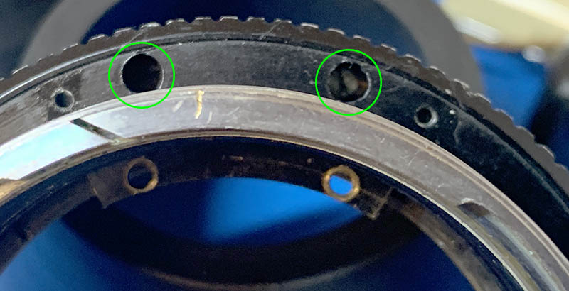 Here is another tricky part to remove. Get a lens spanner that can reach these slots and unscrew the ring. This ring has several slots which makes it more convenient to remove because part of the ring is blocked. You have to be very careful when doing this so you won’t damage anything, it’s easy to cross-thread this ring, if that happened then you will never get this ring off.