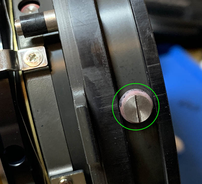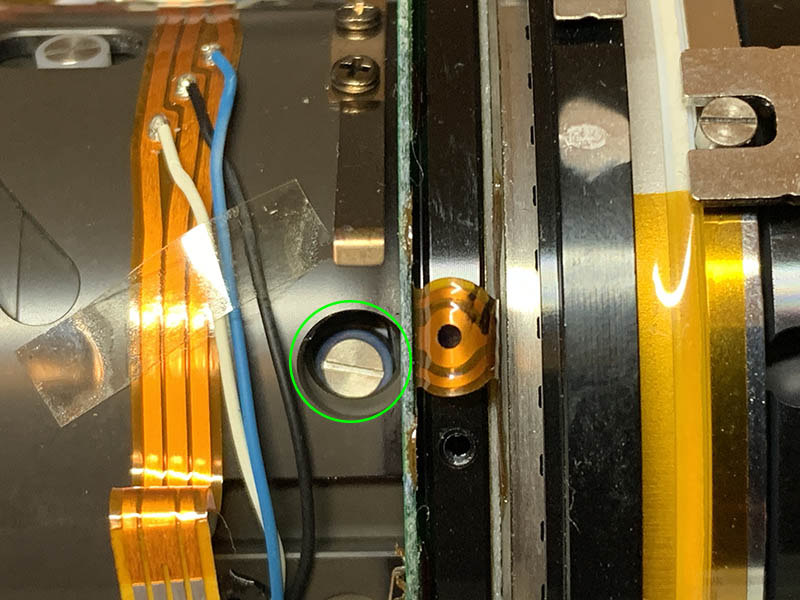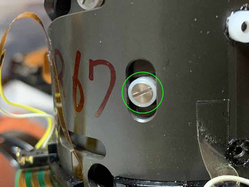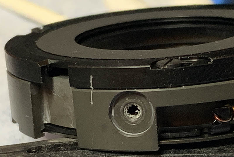 Turn the zoom ring until you can clearly see these, extract the little screws after you have taken notes, the screws secure the zoom-brush, it’s adjustable and it tells the camera which focal length you are on. Mine looks like this, I made a few marks to serve as guides to help me later when I reinstall it.
