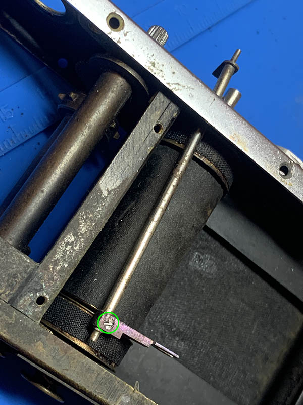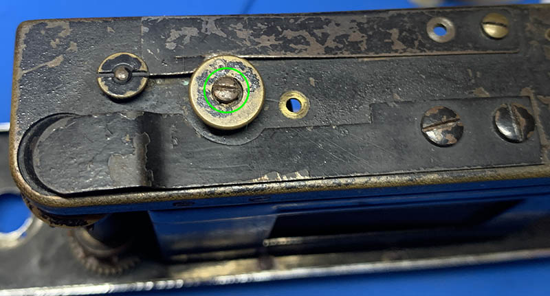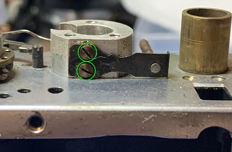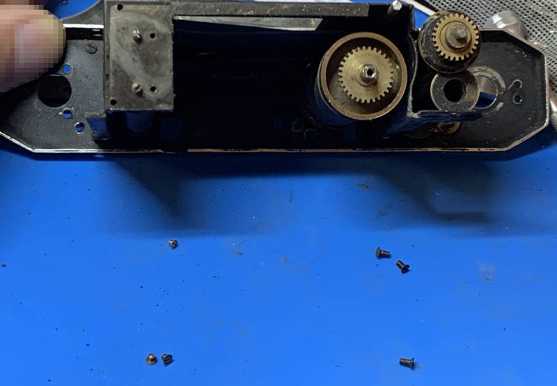 This screw needs to be extracted so you can pull the film advance sprockets off.