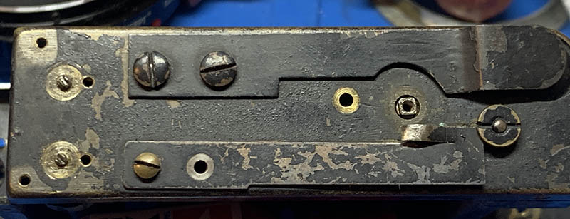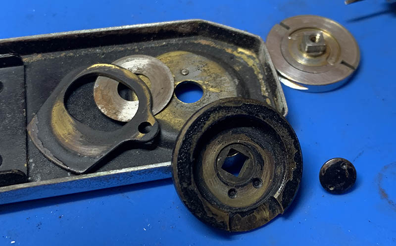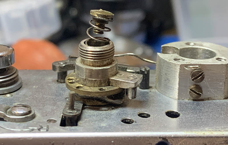 It is interesting to note that there’s a hole at the center of the pressure plate and in the shell underneath this. That hole is plugged with a disc that you can unscrew so you will have direct vision through the hole for peeping. This is used for adjusting the flange distance of the camera. You insert a frosted paper inside the camera as you would do with a sheet of film and then you begin adjusting. I’m very sure that they use something made of glass instead of frosted paper for the adjustment at the factory.