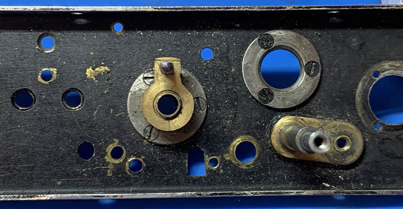At this point, everything should be removed from the top deck except the shaft you see here to the right. That shaft can be difficult to remove so just leave it alone. Clean everything very well and make sure that the old lubricants are all gone. You can even soak all of the gears and turning parts in lighter fluid, that is going to help soften up anything. Brush them very well and use a high magnification loupe to see if there are any stubborn dirt stuck between the teeth, you remove them with a thin plastic toothpick. Scrub all of the nooks and crannies with a strong toilet detergent and rinse them very well. I even rinse the parts with alcohol just to make sure that there’s no residue left.