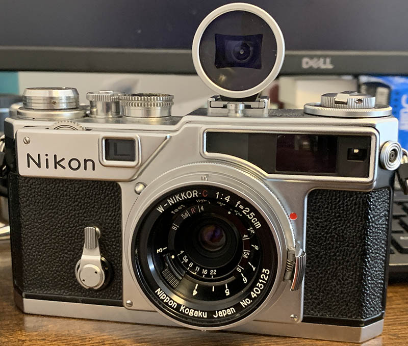 You will need a dedicated viewfinder to be able to frame your shot. Here it is attached to my Nikon SP, it is expensive when purchased by itself. The whole setup is very compact because the lens is shallow, it will only protrude by about 12mm or so, with the whole length residing within the camera itself. The Topogon is just as small, or maybe a bit taller.