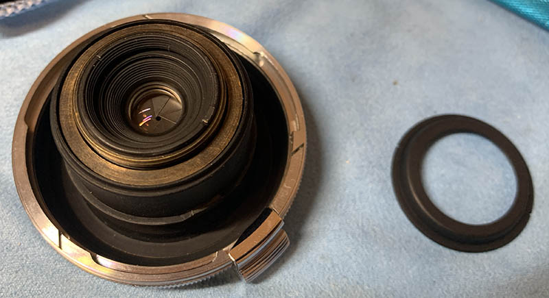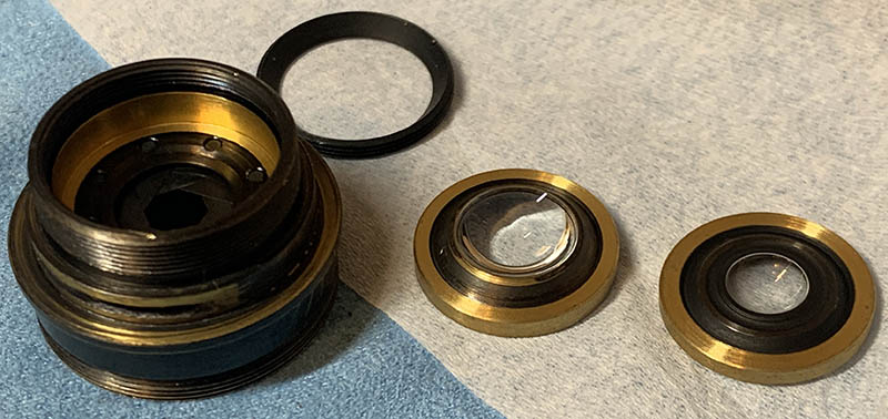 Carefully remove the 3rd and 4th elements and their housings. The safest way to remove them is to use a lens sucker for the 4th element and to drop the 3rd element with its housing onto a soft towel. Be careful not to damage anything especially the 3rd element because it is especially thin.