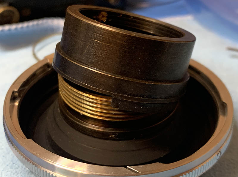 When lubricating, be sure not to apply too much, all you will need is a thin film of fresh grease. Mate the helicoids then exercise them by turning several times, this will ensure that the grease is evenly distributed. Wipe away any excess. If you have applied too much grease it will settle in the iris mechanism eventually, necessitating the need to open it again, just to give everything another overhaul.
