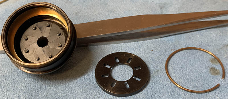 Remove the circlip so you can remove the diaphragm plate. What’s noteworthy about this plate is how it has convex side, that side will face the blades while the flat side faces out. Be aware of this so you should put the diaphragm plate back while the iris blades are partially closed and not fully open like what we’re used to seeing with most lenses.