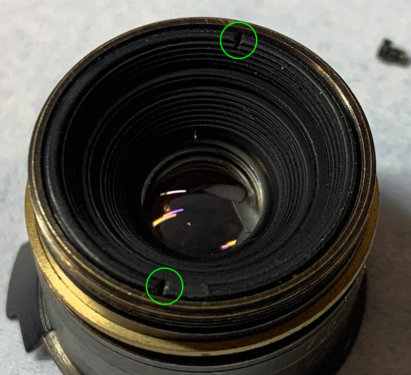 Extract all 3 screws that secure the inner barrel/helicoid to the outer barrel and push the inner barrel out with your fingers. Make sure to note its alignment first so you’ll know how to put it back again later. You don’t need to extract the 2 tall screws for the cap and filter attachment ring in order to do this. You don’t need to dismantle the outer barrel any further unless it’s really dirty.