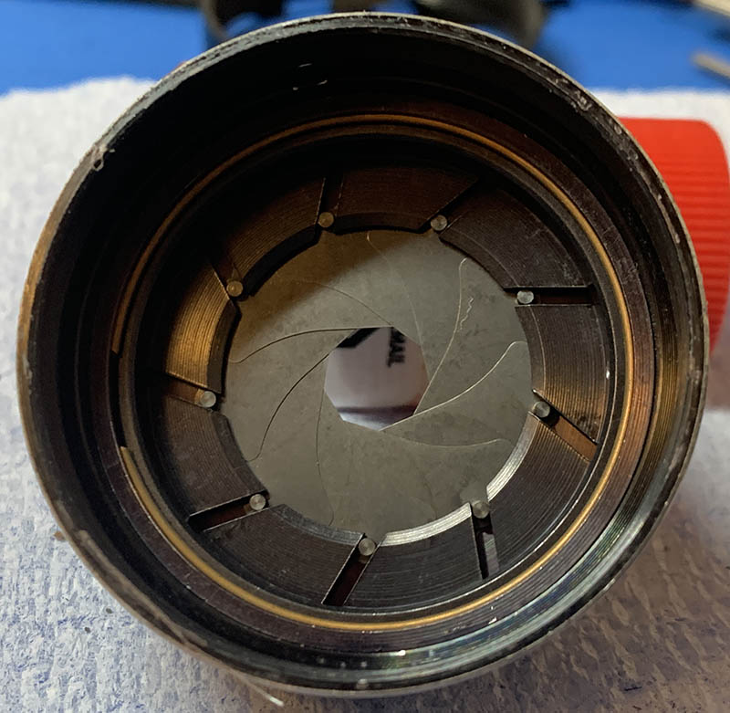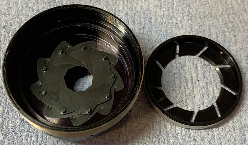 Once the circlip is gone, you can pull the diaphragm plate off. Inspect how the iris looks like so you will know how to put it back again later. I removed them by carefully tapping at the back of the main barrel and letting the blades drop on top of some cushioning so they won’t be damaged as they fall.