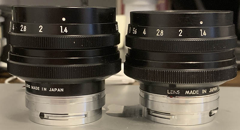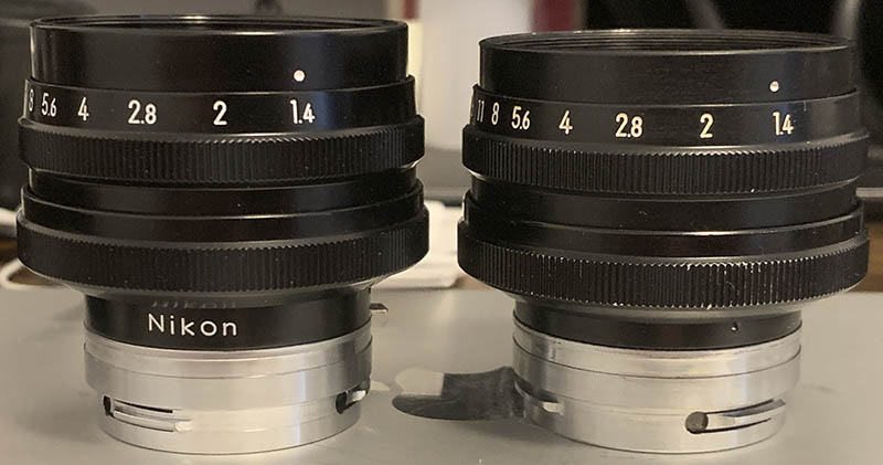There is a noticeable difference in the height and proportions of both lenses when viewed from the side. I find that the older lens is closer to the usual 50mm rangefinder Nikkor in terms of proportion. There’s also no “Nikon” engraved in the black part of the barrel.