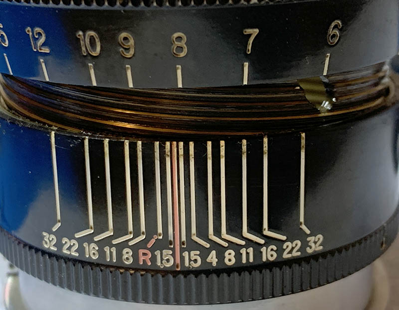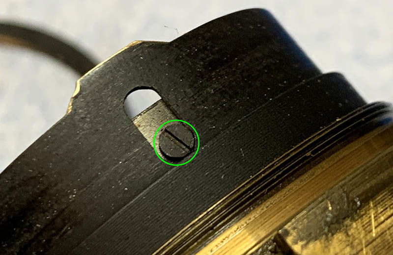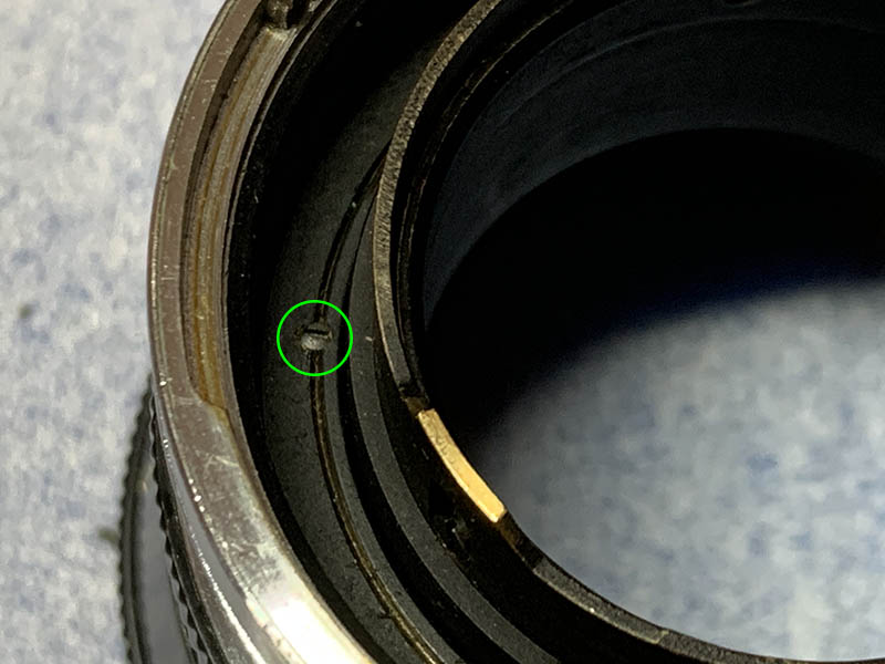 Now that the focusing cam assembly is gone, you’ll be able to freely turn the focusing ring beyond what is indicated by the focusing range. Collapse the helicoid and see how much it will go, mine stops here. It is very important too to get the same position later when you put it back after cleaning, if it’s off then you have screwed up the job and you’ll have to find the correct making point until you get it right.