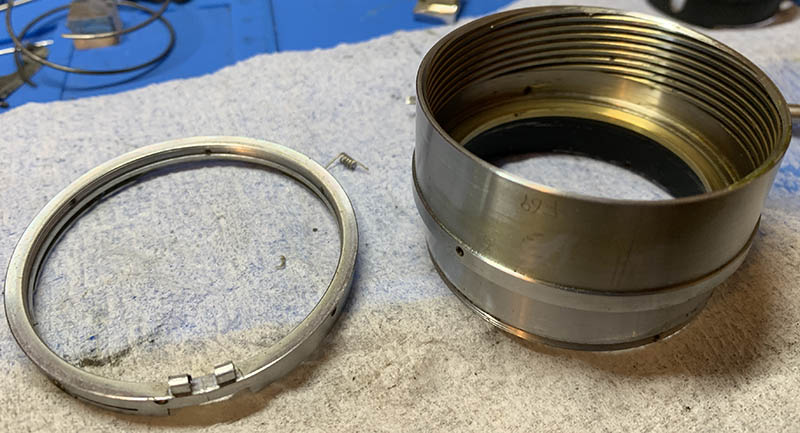 The front barrel also houses the iris mechanism so I will condense this article by including it here. There is not a lot of complicated assemblies here, just very delicate ones. This is a job for the professionals, the iris alone is a tough job to put back together and you will require the patience of a saint to be able to put the blades back in one go. It is very common to find these with oily blades and the only real way to address it is to do an overhaul of the iris mechanism.