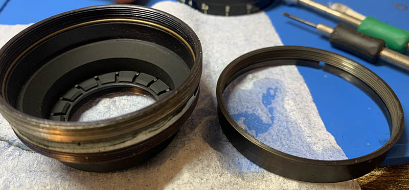 Unscrew the front helicoid until it separates. Don’t forget to note where they parted since it’s also the same spot where these should mesh. Many people forget to do this so they get stuck guessing where these should mate. To prevent this from happening to you read my article about servicing helicoids and follow my guide to the best of your ability.