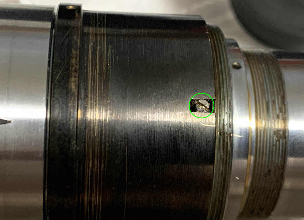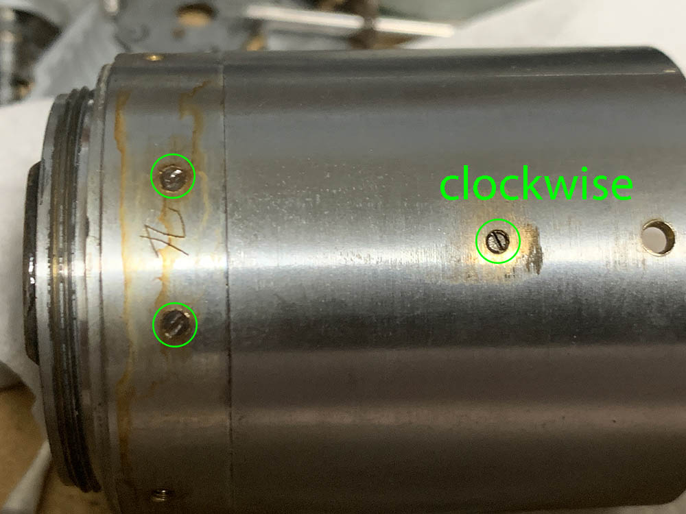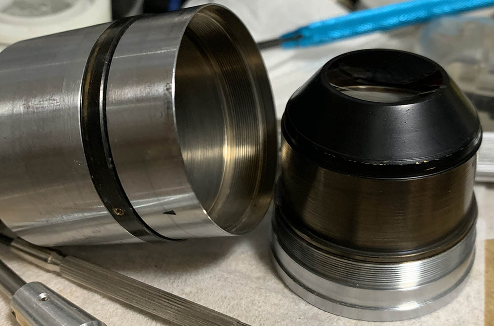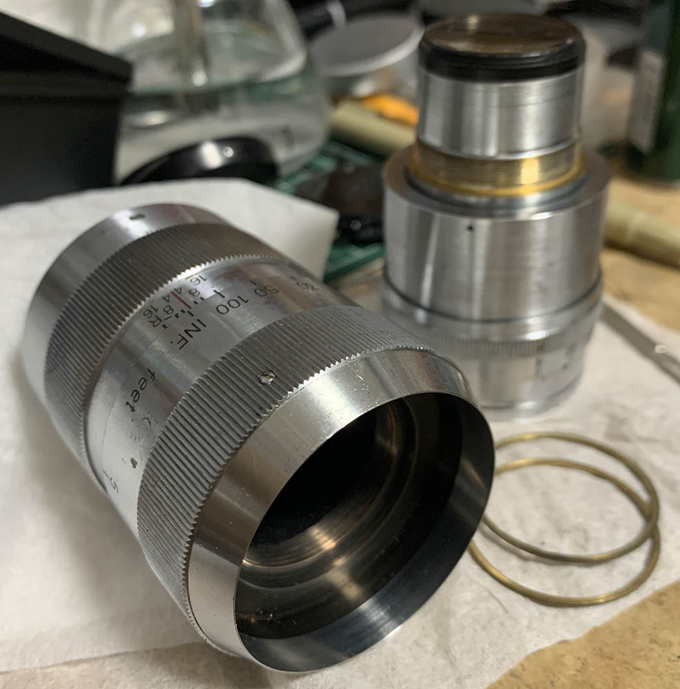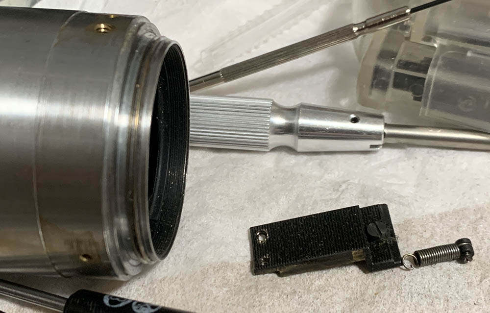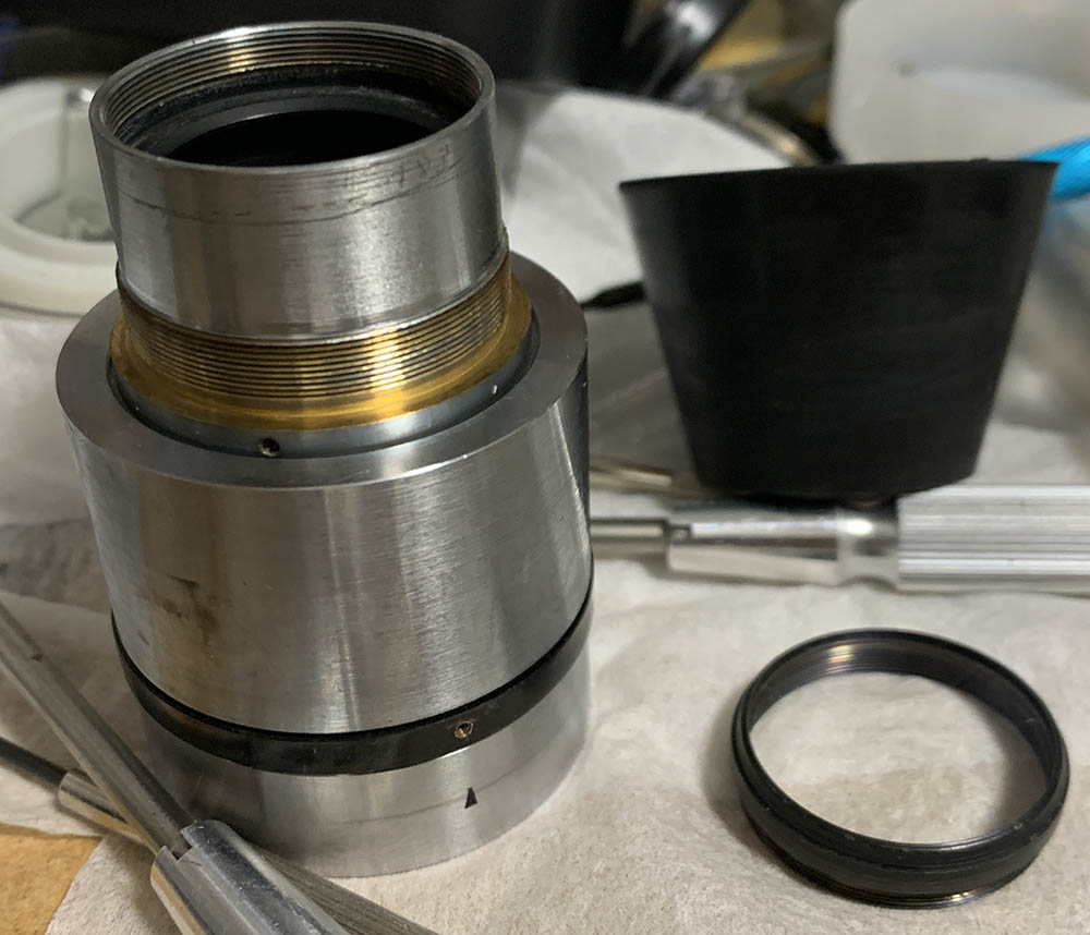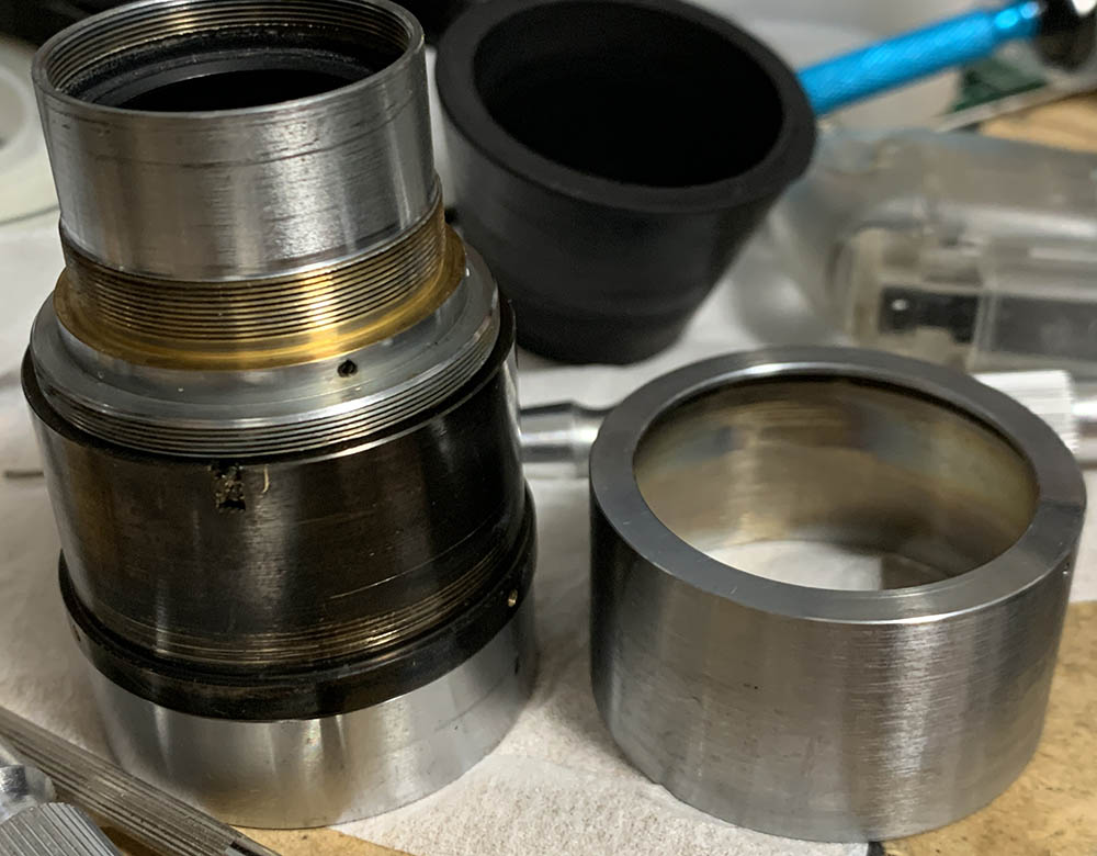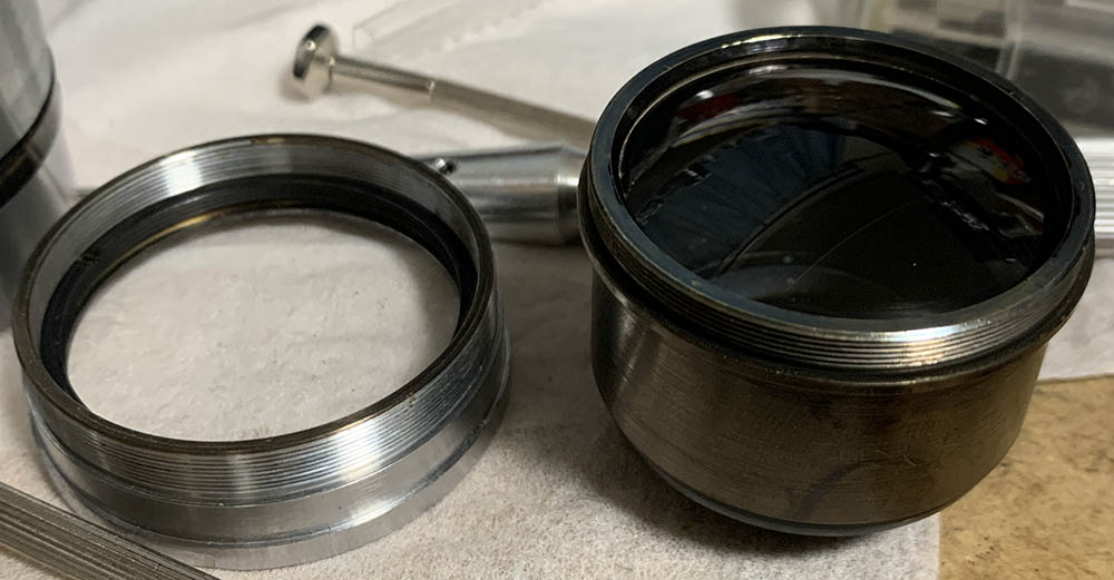 Notice that there are shims found under the front barrel, these are used to adjust the focus of the lens. If you have lost or damaged any of these you won’t be able to find replacements and you should fabricate them yourself and make measurements. Set the front barrel aside and keep it safe so it won’t roll-off the edge of the table.